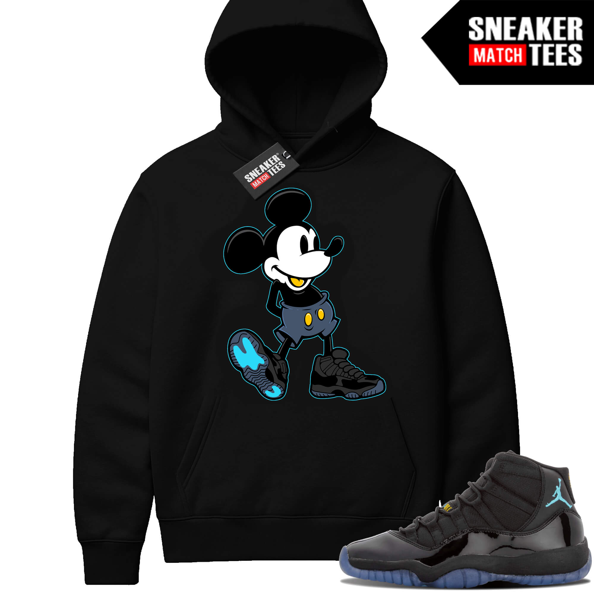 Gamma Blue 11 Sneaker Match Black Hoodie Sneakerhead Mickey. Sneaker Match Hoodies designed to match Rare Air 11s colorway. Sneaker clothing and apparel to match Jordan 11 Rare Air retro sneakers.