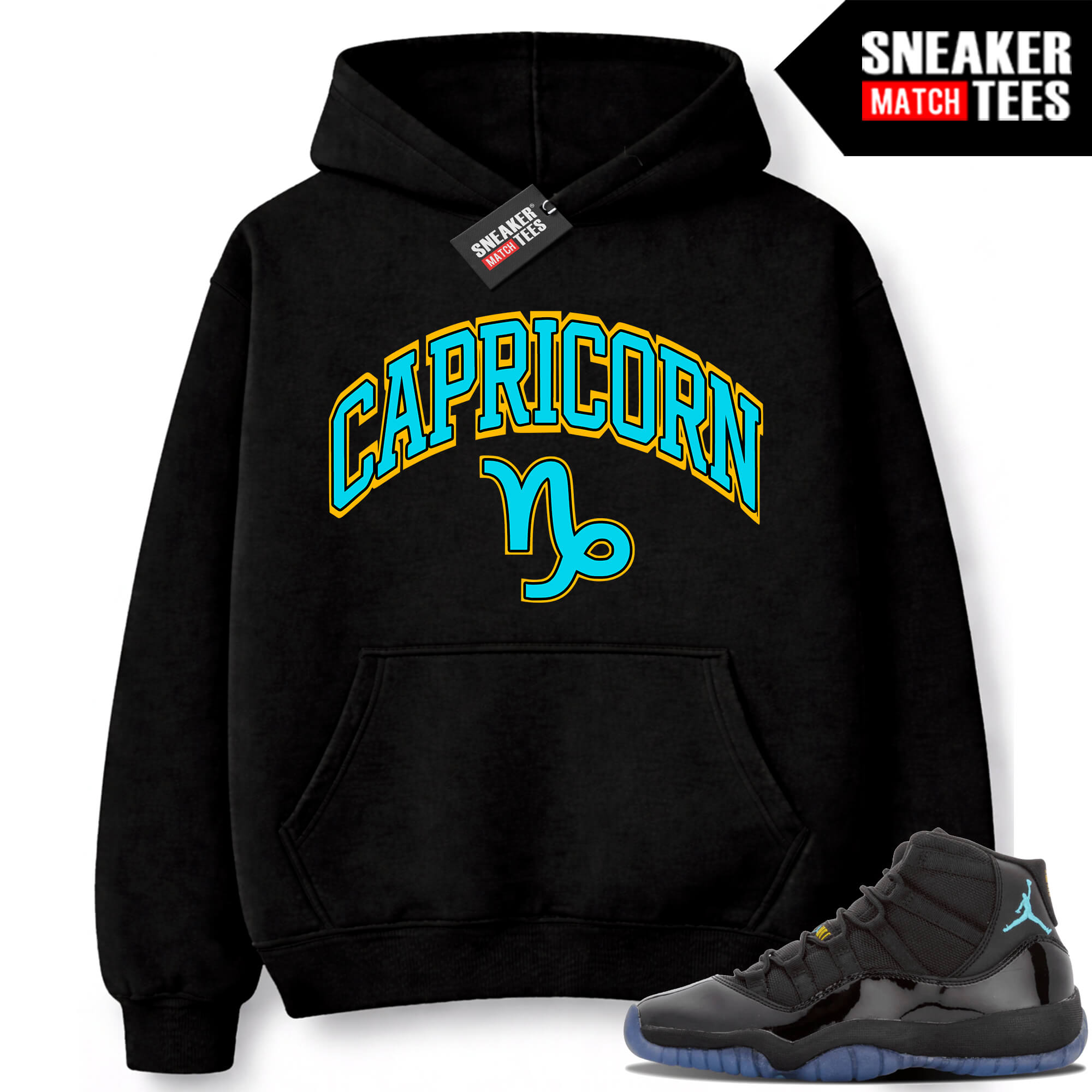 Gamma Blue 11s Sneaker Match Hoodie Black CAPRICORN. Sneaker Match Hoodies designed to match Rare Air 11s colorway. Sneaker clothing and apparel to match Jordan 11 Rare Air retro sneakers.