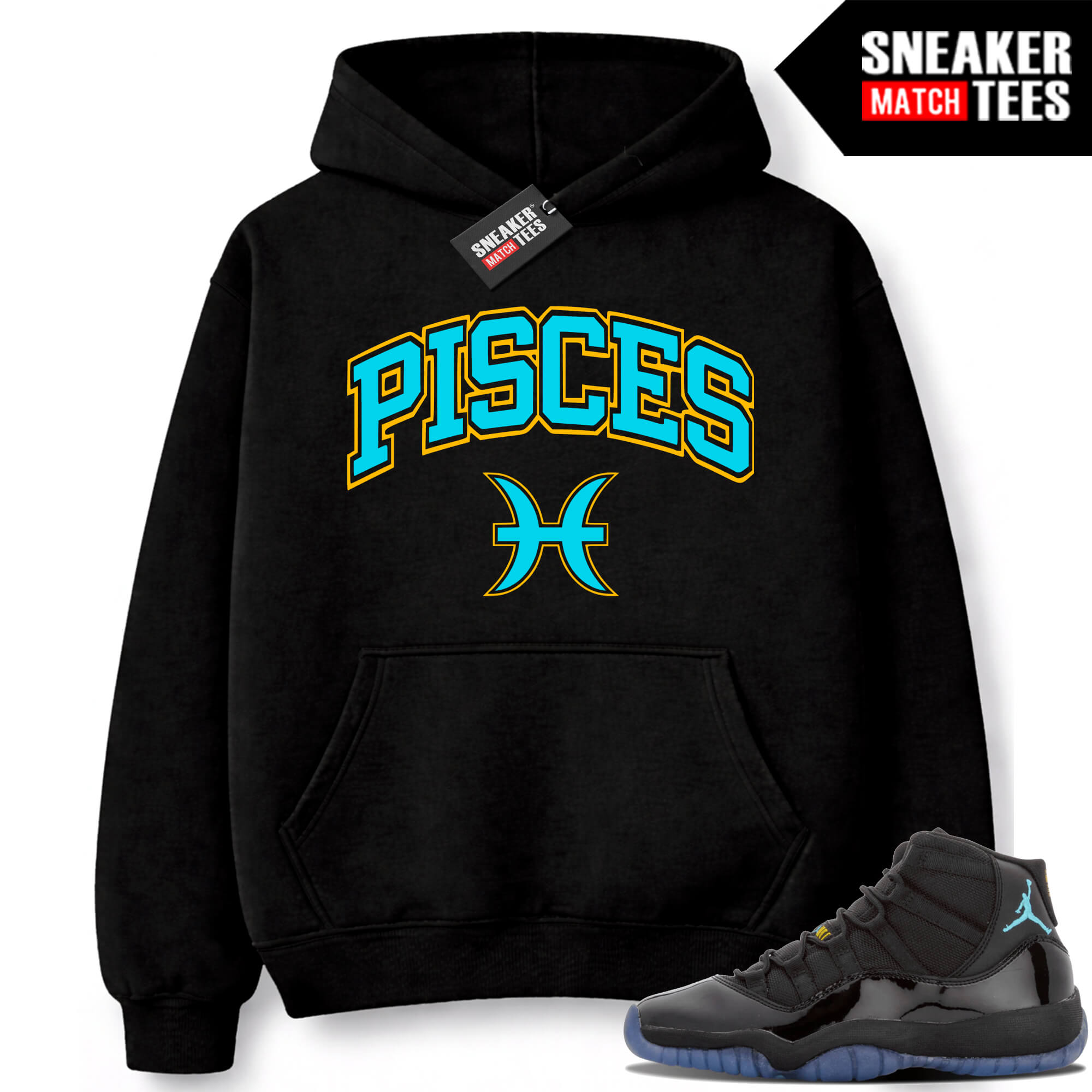 Gamma Blue 11s Sneaker Match Hoodie Black PISCES. Sneaker Match Hoodies designed to match Rare Air 11s colorway. Sneaker clothing and apparel to match Jordan 11 Rare Air retro sneakers.