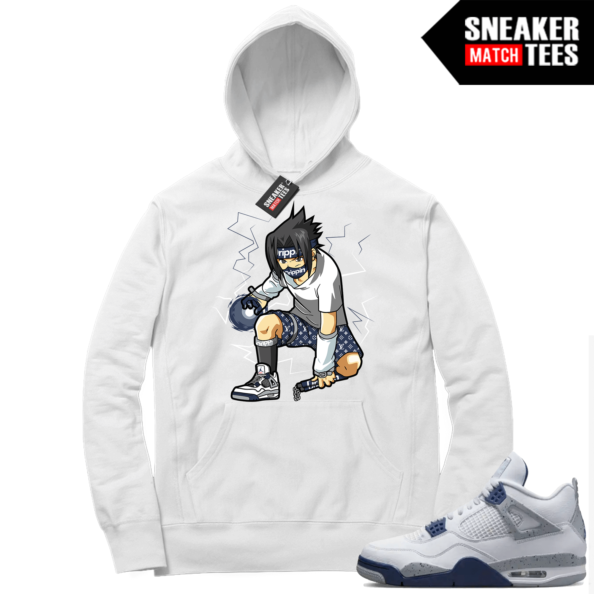 The Jordan 4 Midnight Navy “Sasuke Hype” hoodie was designed to match with your Air Jordan sneakers. This design is exclusive to Sneaker Match Tees Online shop. Complete your Sneaker outfit with this exclusive design.