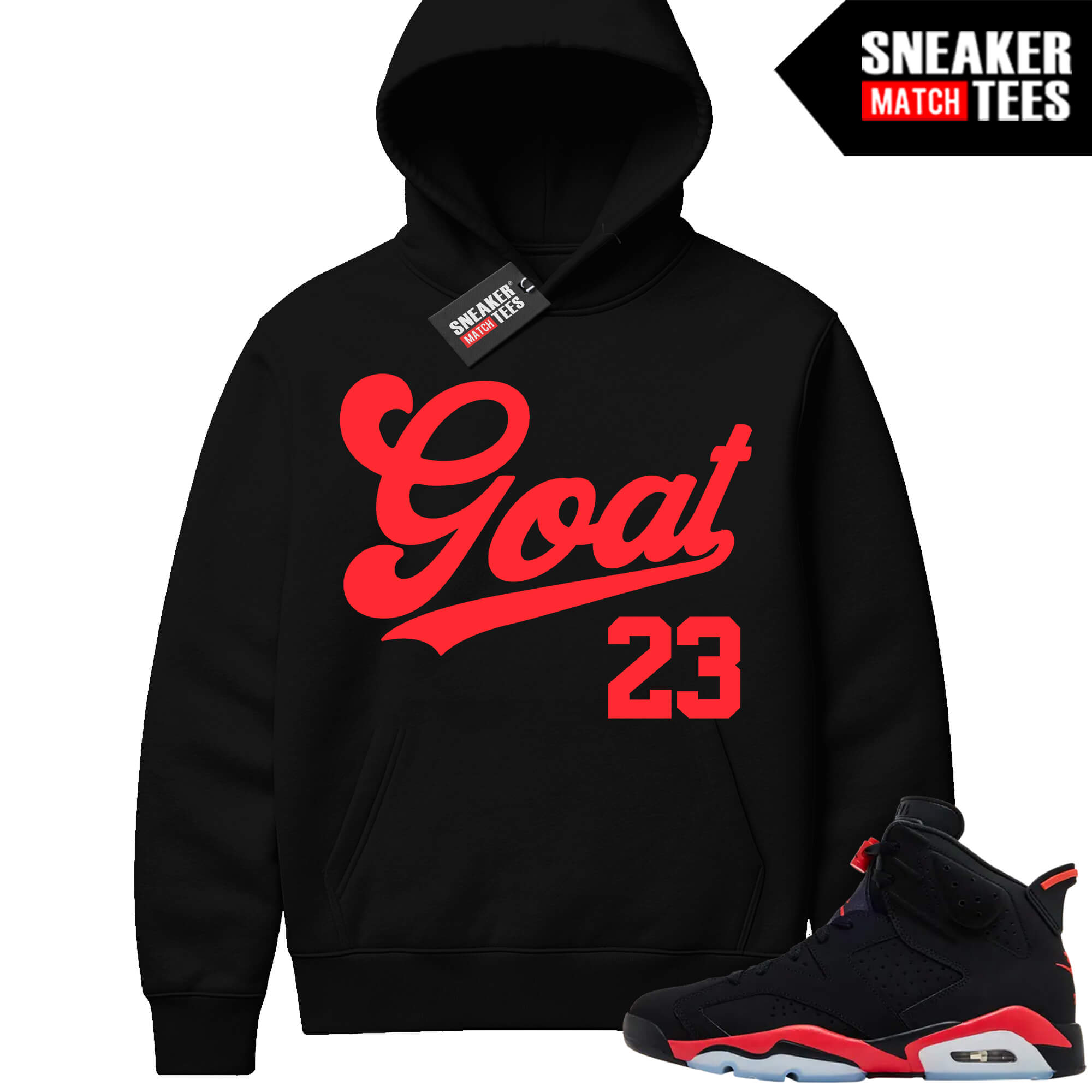 Infrared 6s Reverse Sneaker Match Hoodies Black Goat Script. Sneaker Match Hoodies designed to match Infrared 6s colorway. Sneaker clothing and apparel to match Jordan 6 Infrared retro sneakers.