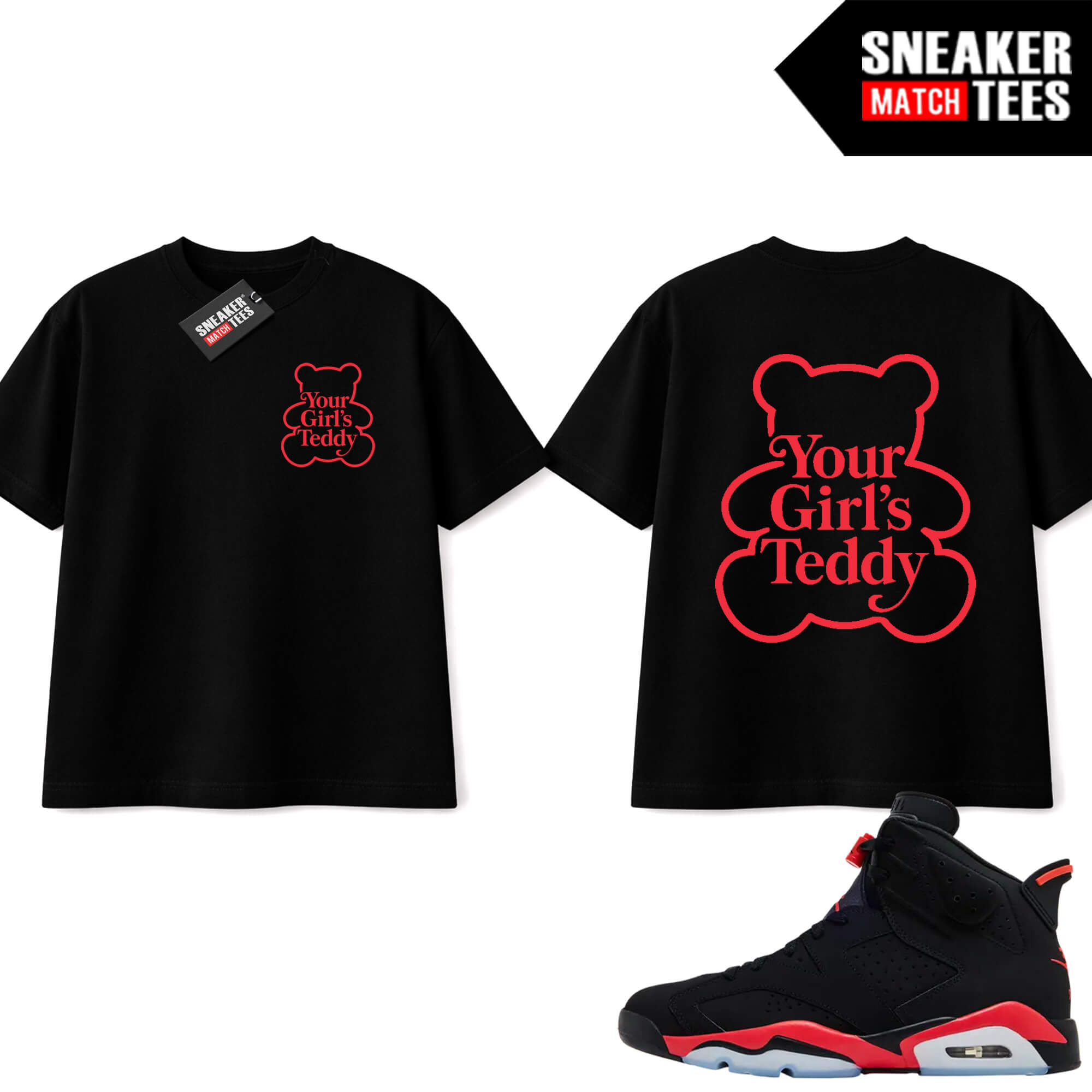 The “Black Valentines Day Your Girls Teddy” Tee shirt was designed to match with your Jordan 8 sneakers. This design is exclusive to Sneaker Match Tees Online shop. Complete your Sneaker outfit with this exclusive design.