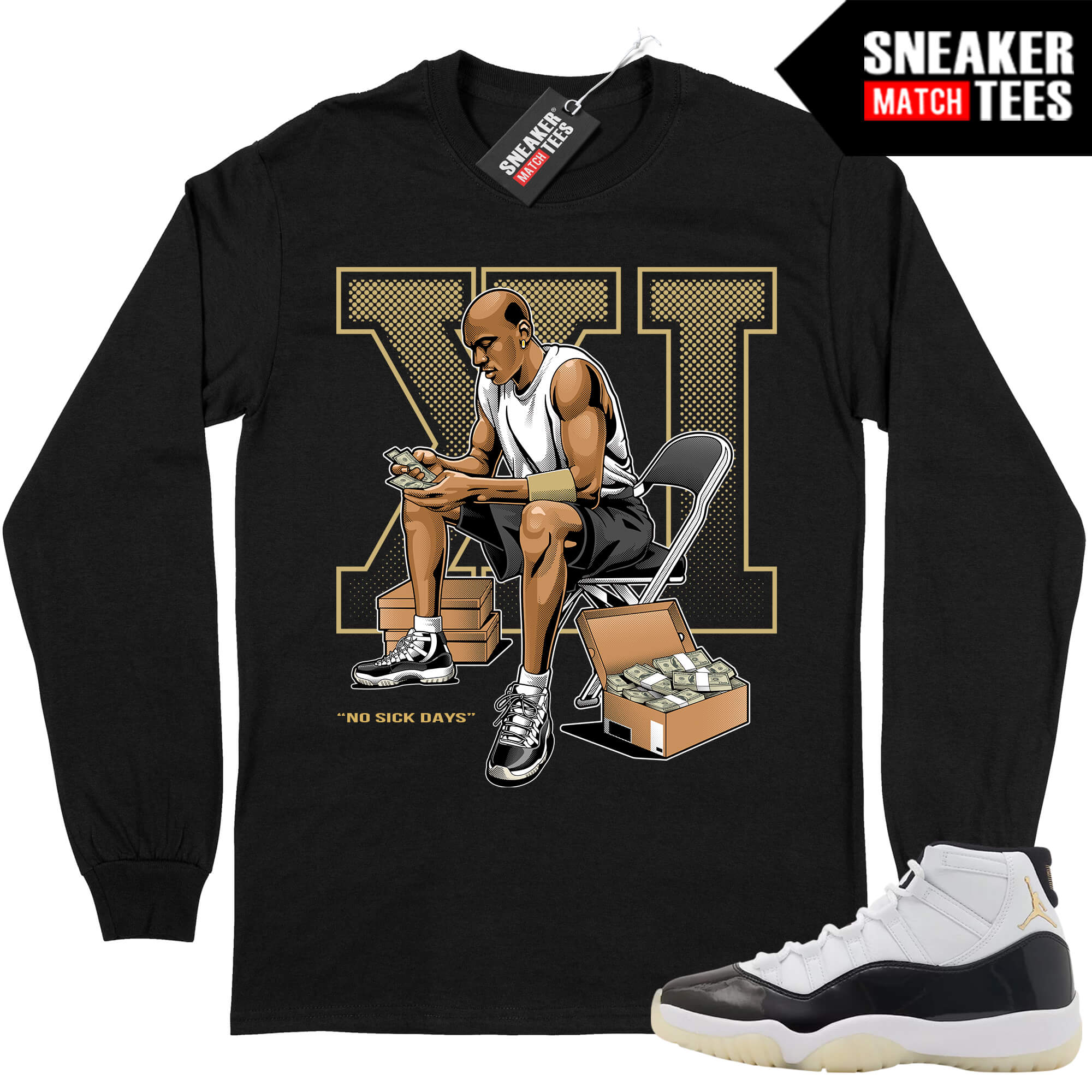 Jordan 11 DMP Gratitude Sneaker Match Long Sleeve Shirt Black No Sick Days MJ. Sneaker Match Tees Long Sleeve designed to match Gratitude DMP 11s colorway. Sneaker clothing and apparel to match Jordan 11 DMP Gratitude retro sneakers.