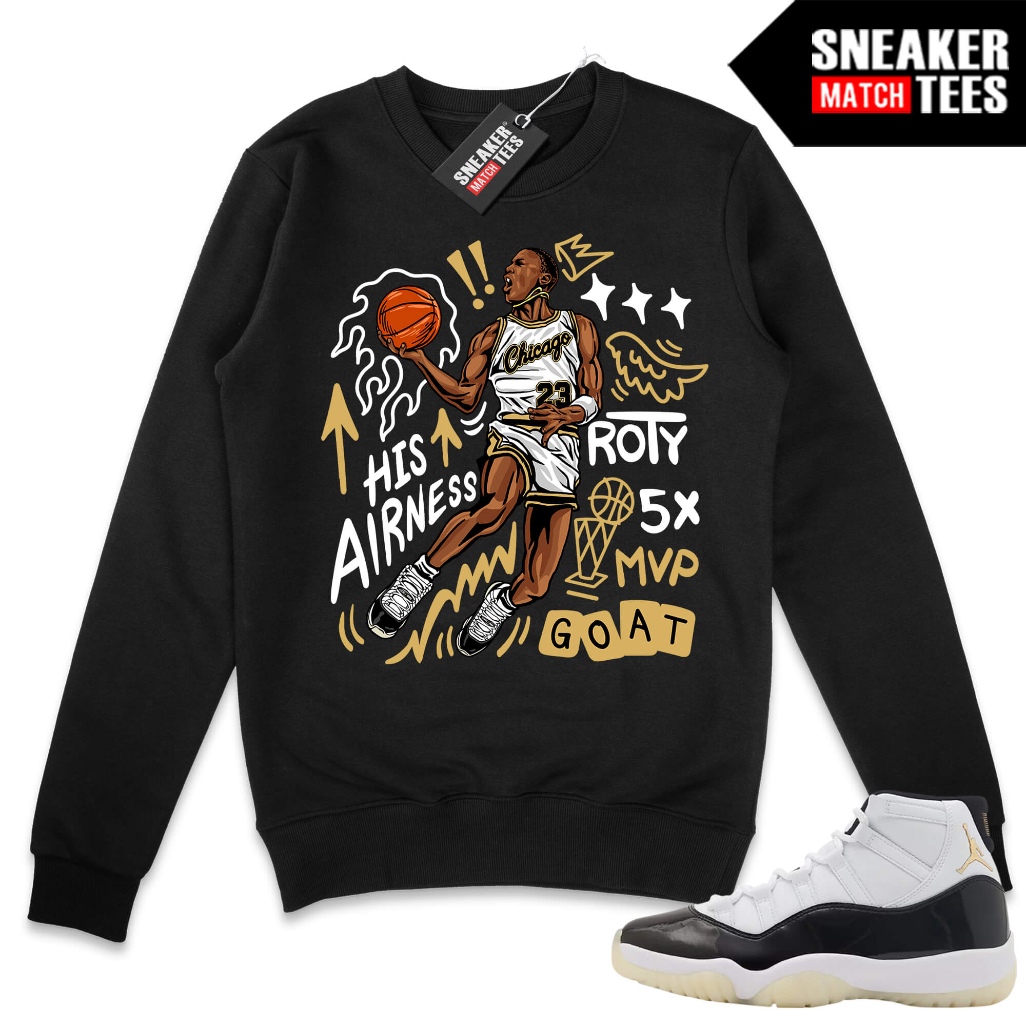 Jordan 11 DMP Gratitude Sneaker Match Sweater Crewneck Black MJ His Airness. Sneaker Match Sweater designed to match Gratitude DMP 11s colorway. Sneaker clothing and apparel to match Jordan 11 DMP Gratitude retro sneakers.