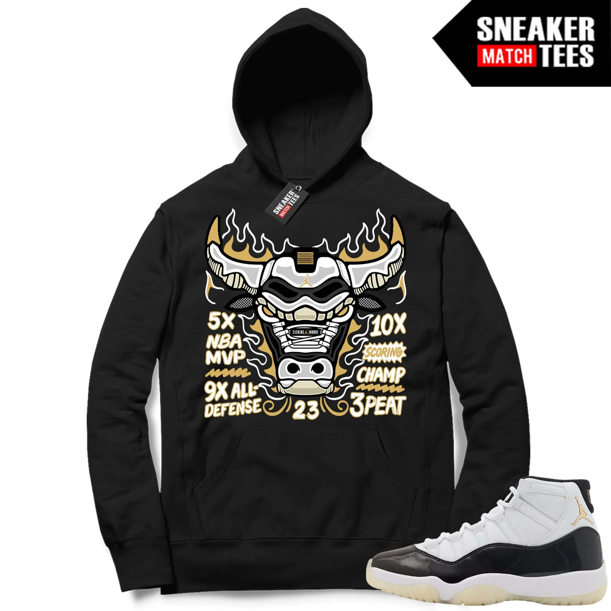 Jordan 11 Gratitude DMP Sneaker Match Hoodie Black DMP Bull Accolades. Sneaker Match Hoodies designed to match Gratitude DMP 11s colorway. Sneaker clothing and apparel to match Jordan 11 DMP Gratitude retro sneakers.
