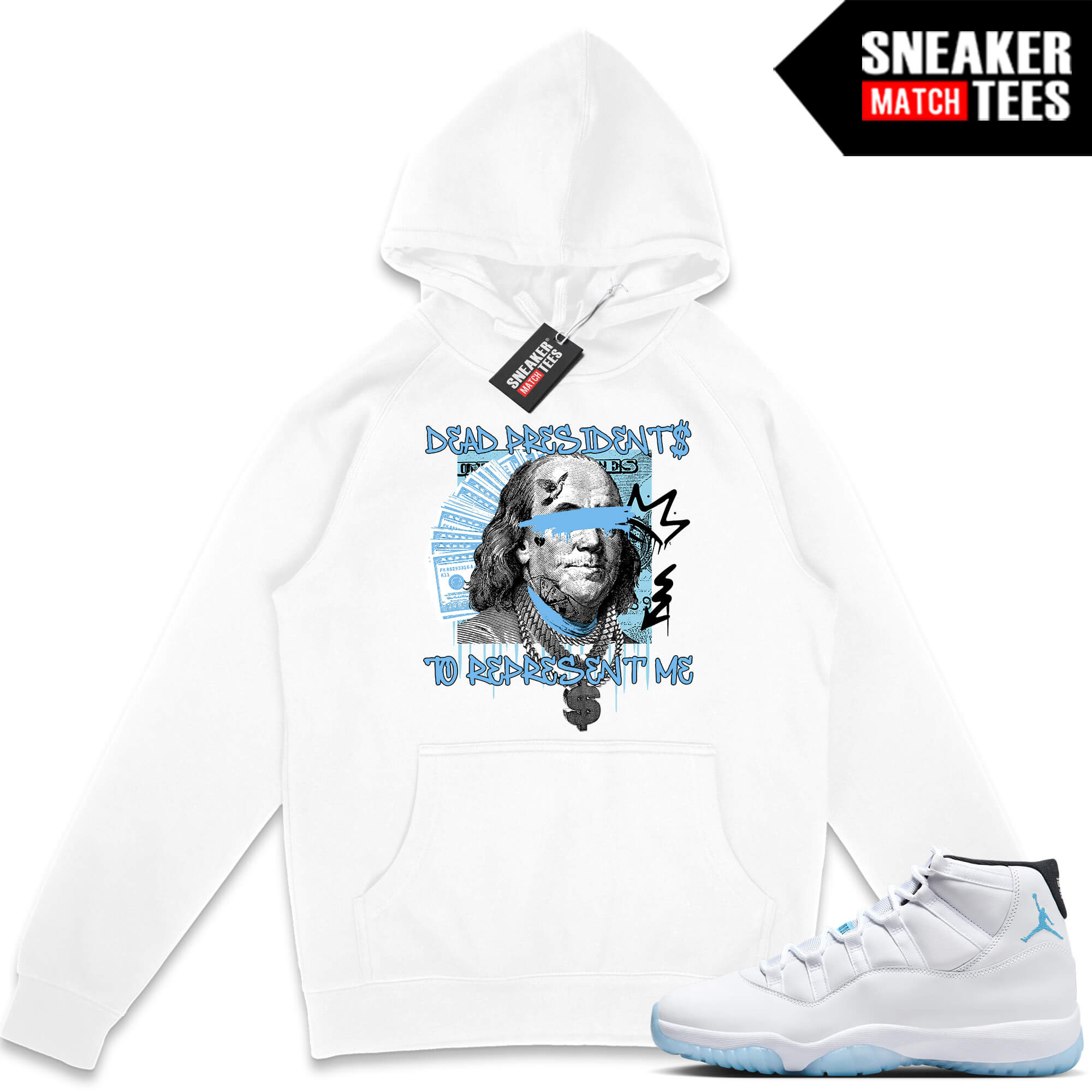 Jordan 11 Legend Blue Sneaker Match Hoodie White Dead Presidents. Sneaker Match Hoodies designed to match Legend Blue 11s colorway. Sneaker clothing and apparel to match Jordan 11 Legend blue retro sneakers.