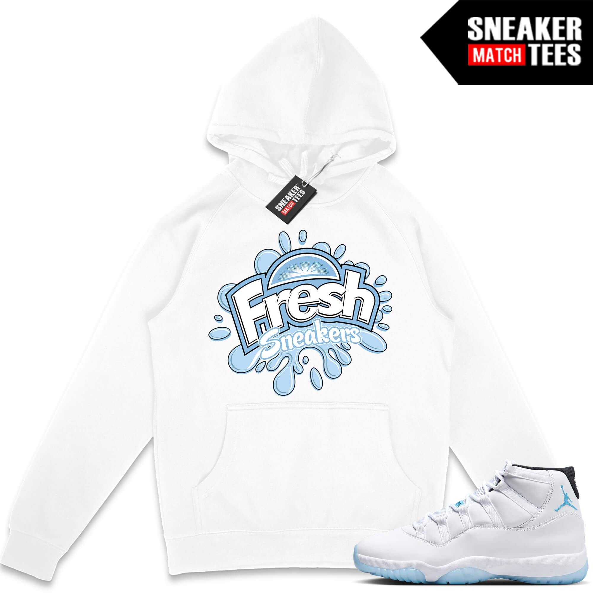 Jordan 11 Legend Blue Sneaker Match Hoodie White Fresh Sneakers. Sneaker Match Hoodies designed to match Legend Blue 11s colorway. Sneaker clothing and apparel to match Jordan 11 Legend blue retro sneakers.
