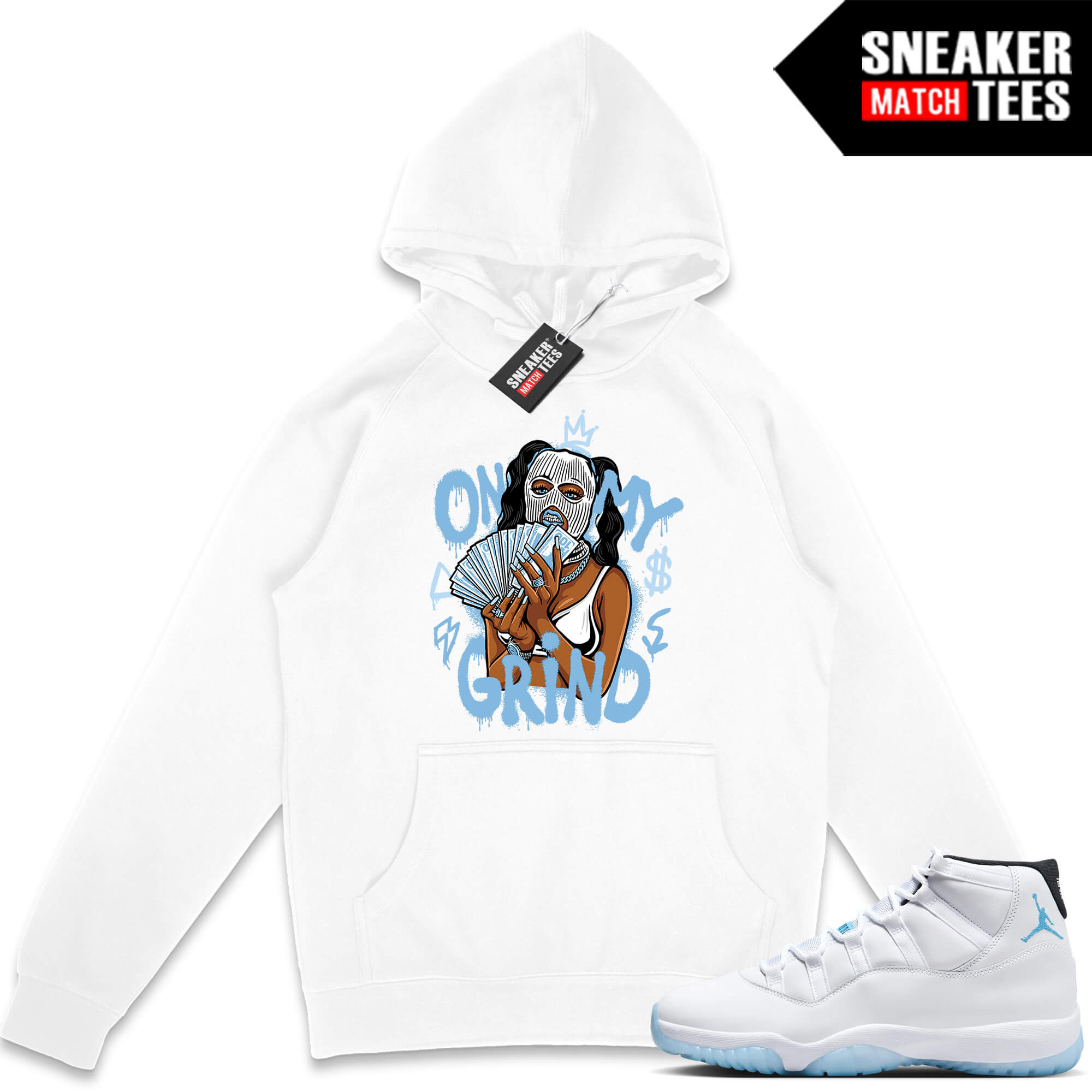 Jordan 11 Legend Blue Sneaker Match Hoodie White On My Grind. Sneaker Match Hoodies designed to match Legend Blue 11s colorway. Sneaker clothing and apparel to match Jordan 11 Legend blue retro sneakers.