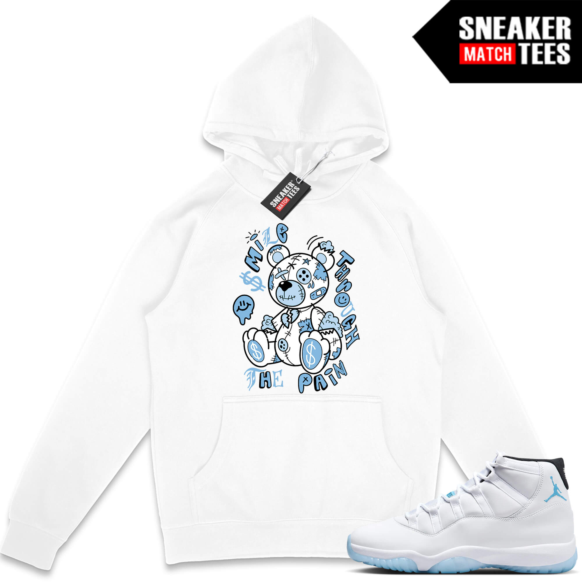 Jordan 11 Legend Blue Sneaker Match Hoodie White Smile Bear. Sneaker Match Hoodies designed to match Legend Blue 11s colorway. Sneaker clothing and apparel to match Jordan 11 Legend blue retro sneakers.