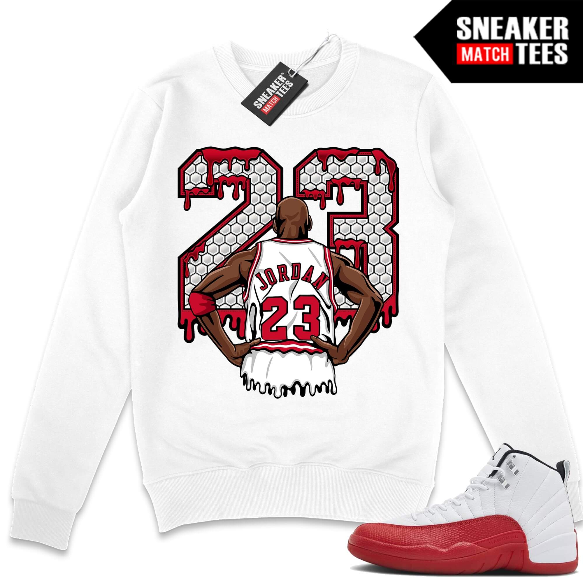 Jordan 12 Cherry Sneaker Match Sweater White 23 MJ Drip. Sneaker Match Sweaters designed to match Cherry 12s colorway. Sneaker clothing and apparel to match Jordan 12 Cherry retro sneakers.