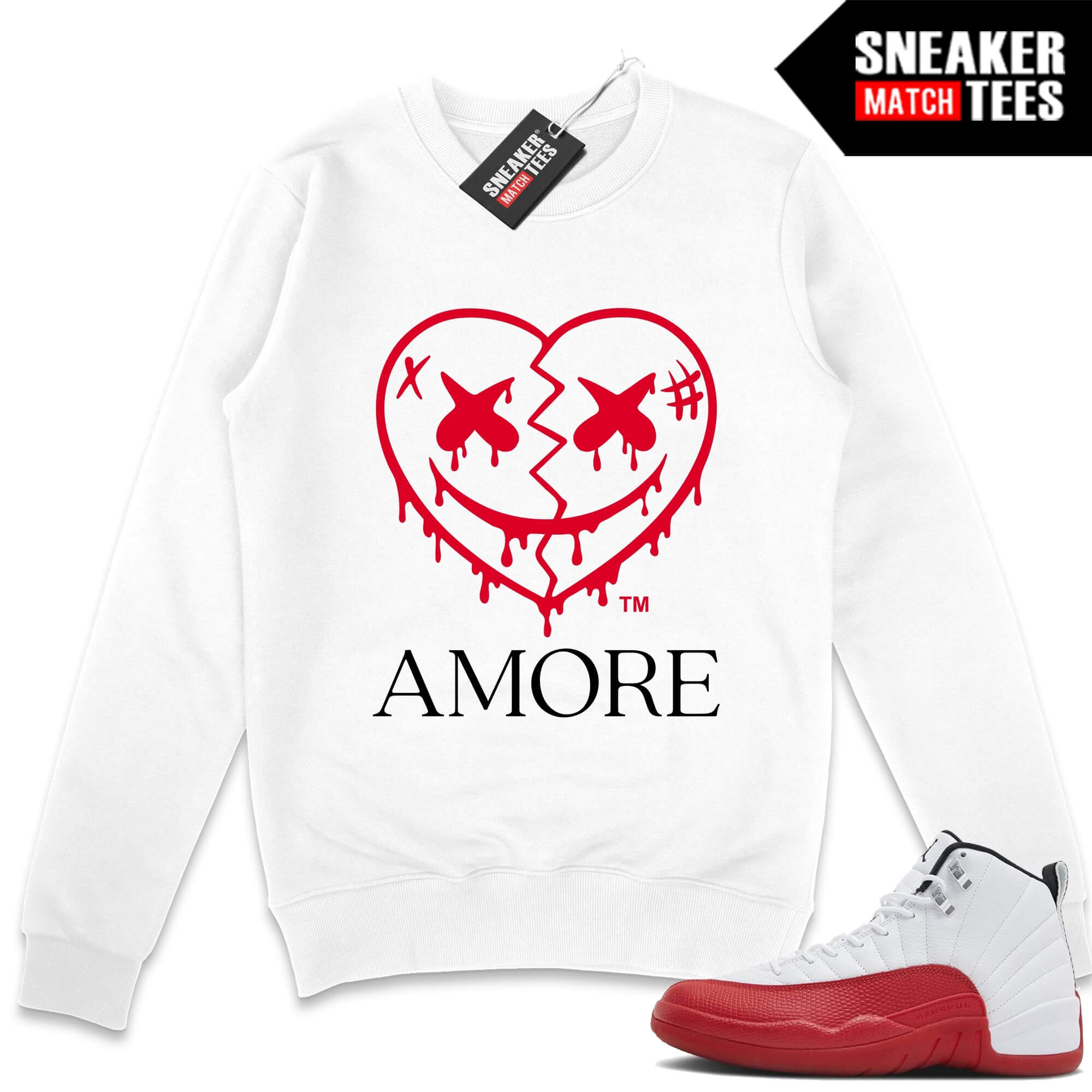 Jordan 12 Cherry Sneaker Match Sweater White AMORE Crazy Love Heart. Sneaker Match Sweaters designed to match Cherry 12s colorway. Sneaker clothing and apparel to match Jordan 12 Cherry retro sneakers.