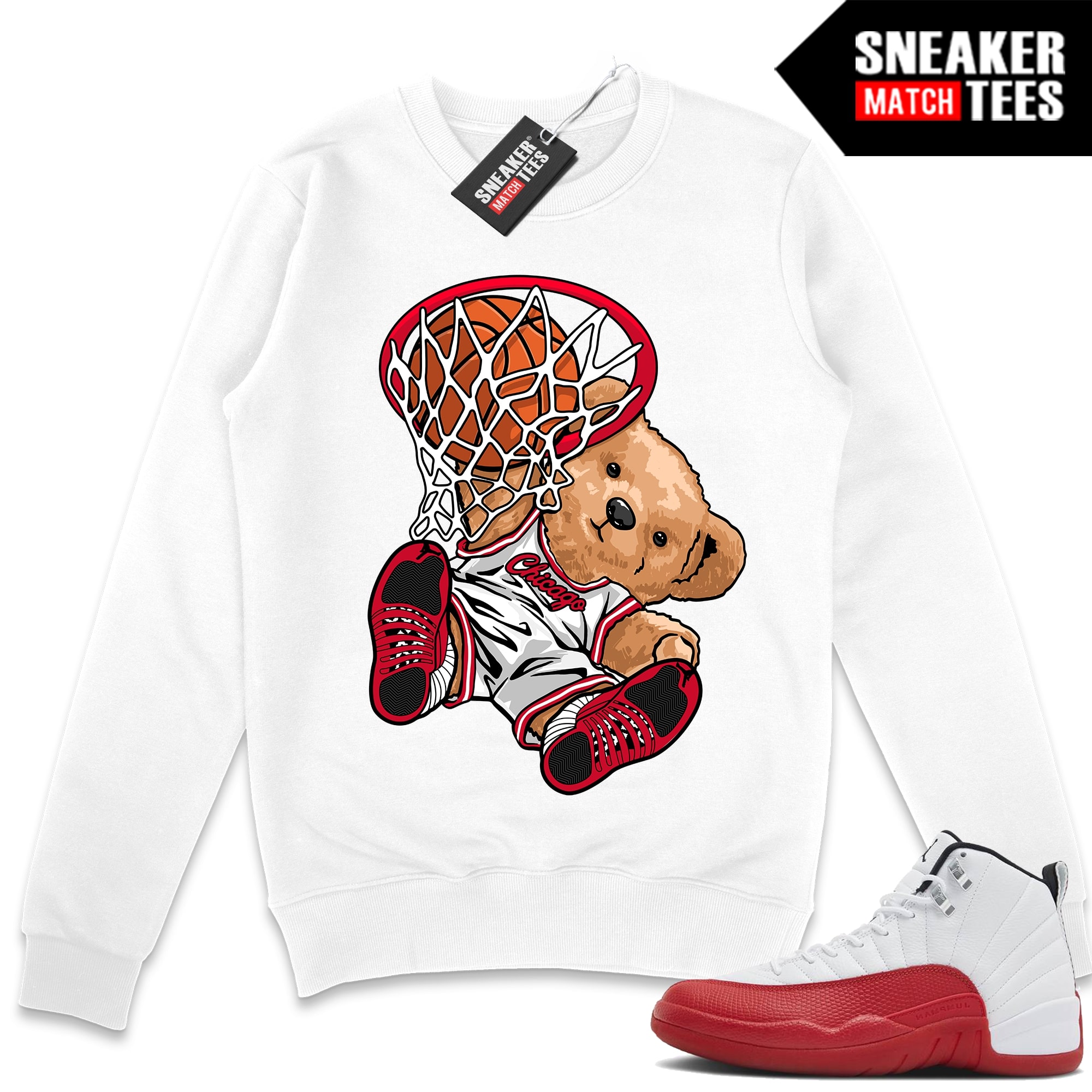 Jordan 12 Cherry Sneaker Match Sweater White Slam Dunk Bear. Sneaker Match Sweaters designed to match Cherry 12s colorway. Sneaker clothing and apparel to match Jordan 12 Cherry retro sneakers.