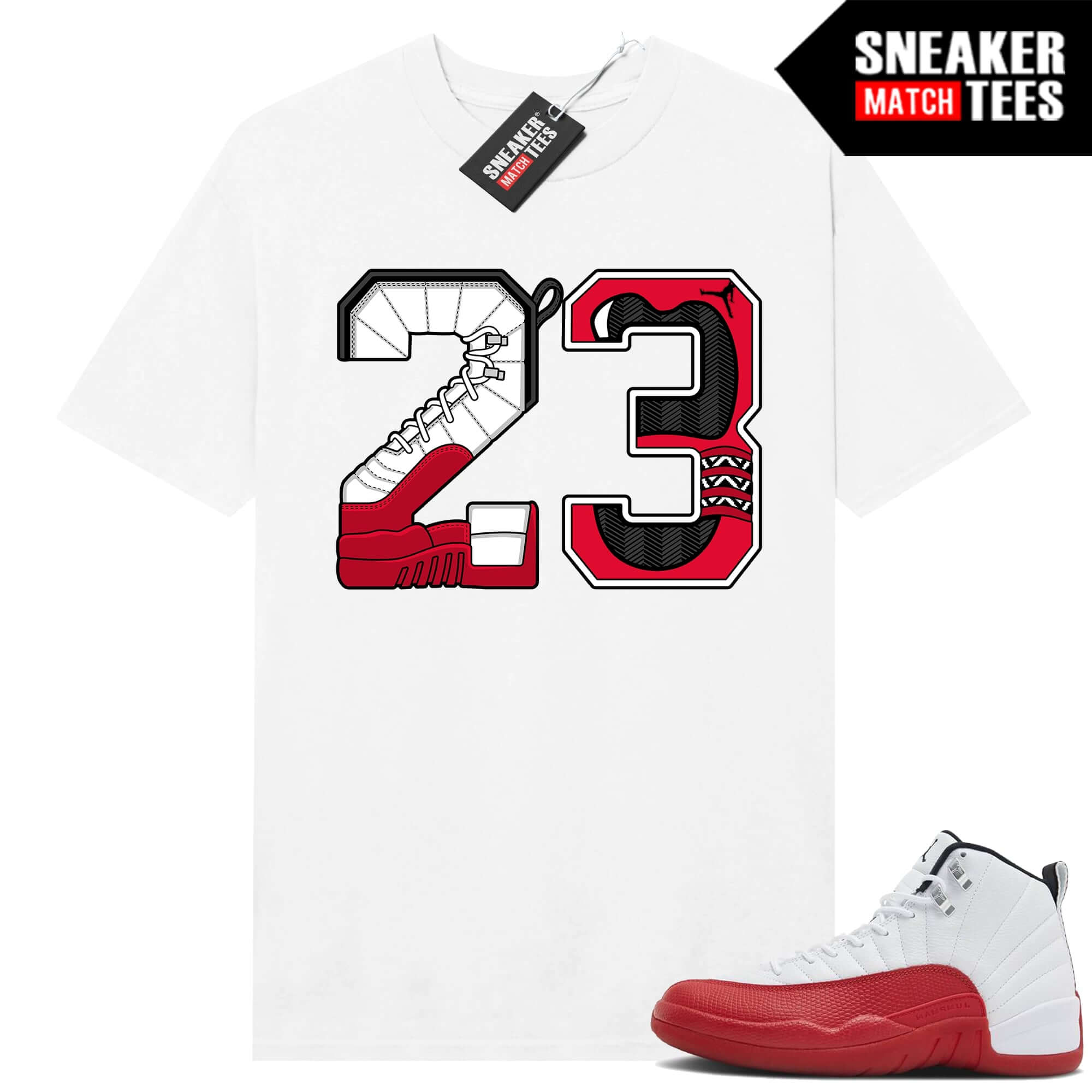 Jordan 12 Cherry Sneaker Tees Match White 23. Sneaker Match Tees designed to match Cherry 12s colorway. Sneaker clothing and apparel to match Jordan 12 Cherry retro sneakers.