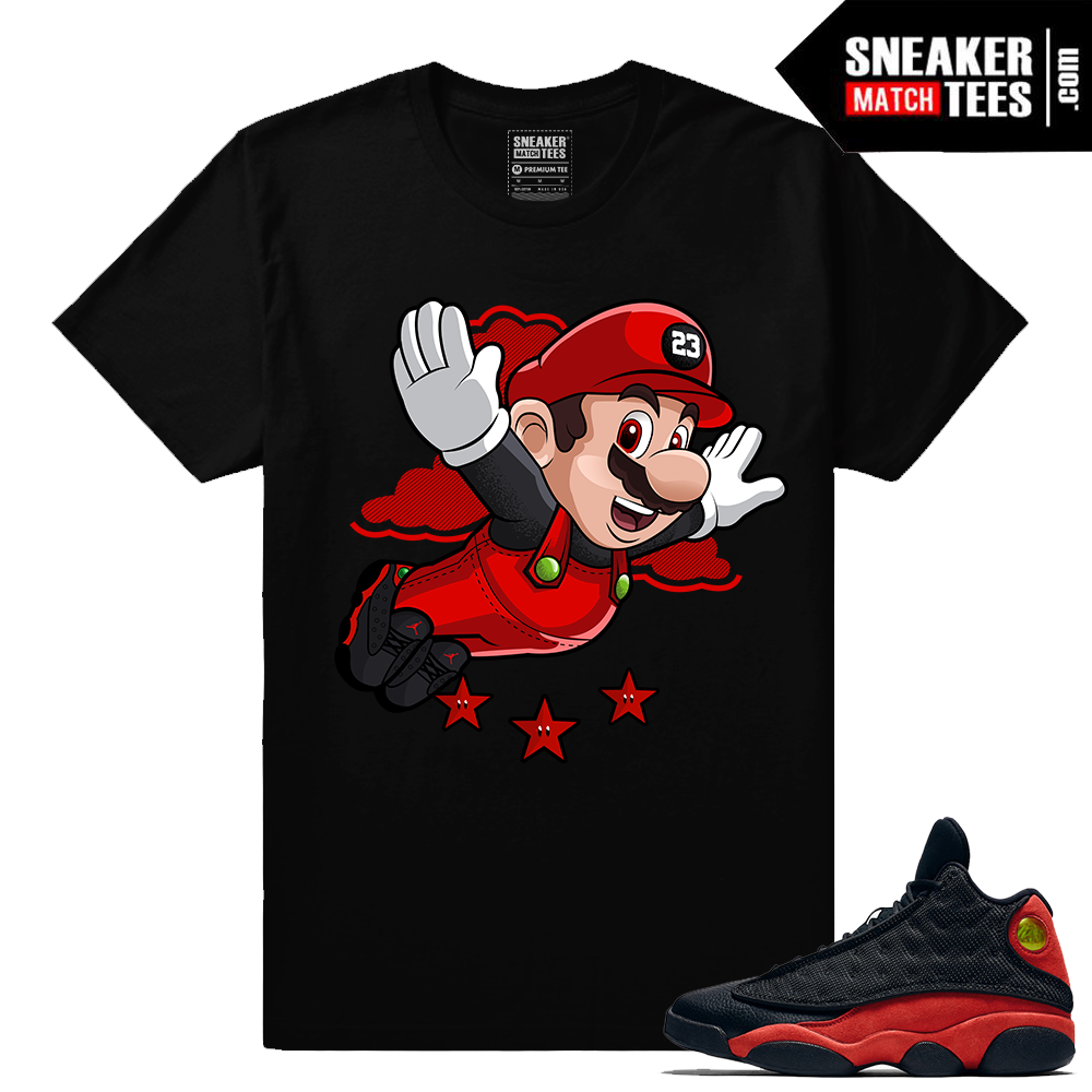 Jordan 13 Bred Matching Sneaker tees Streetwear. Bred 13s “Mario Fly” Black Streetwear t shirt. Jordan 13 Bred 2017 shirts to match streetwear clothing collection. Matching Streetwear Sneaker tees shirts. Air Jordan Bred 13 sneaker colorway. View the entire matching collection of Jordan 13 Bred Shirts.