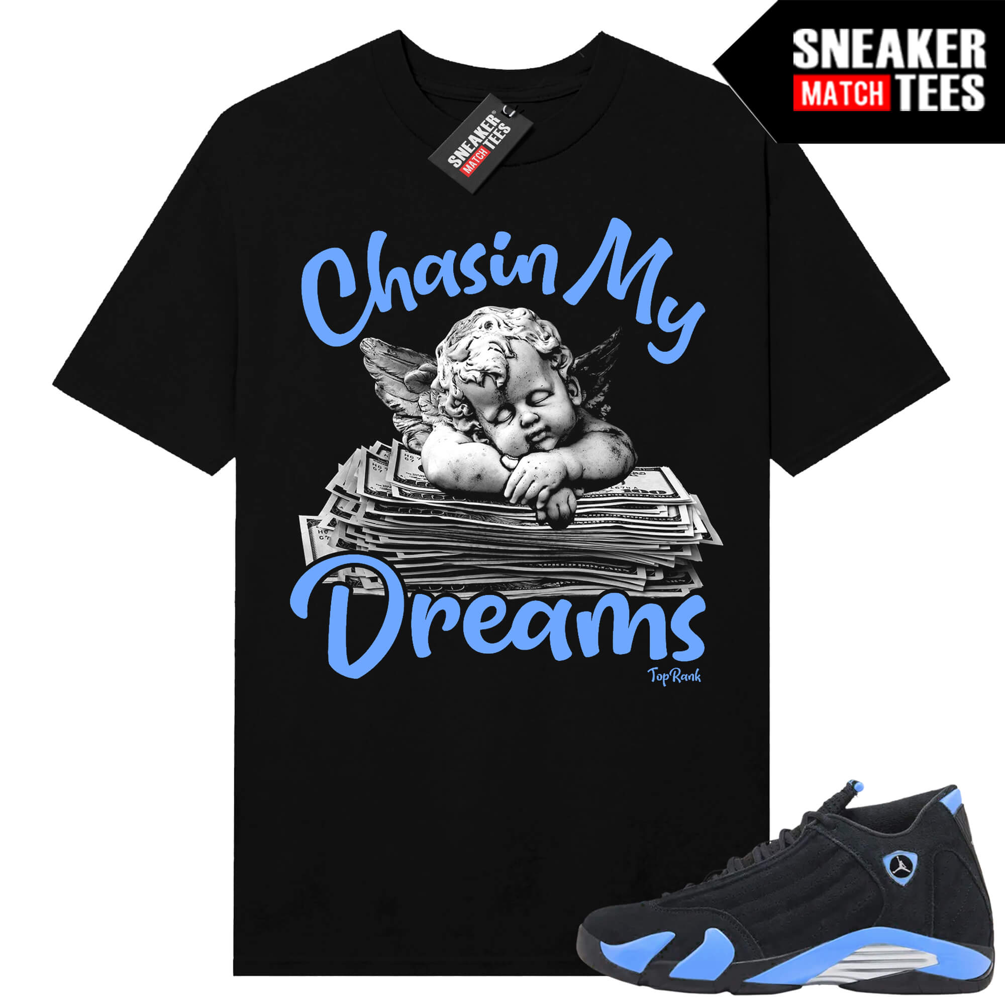 The “Chasin My Dreams” Tee shirt was designed to match with your Jordan 14 sneakers. This design is exclusive to Sneaker Match Tees Online shop. Complete your Sneaker outfit with this exclusive design.