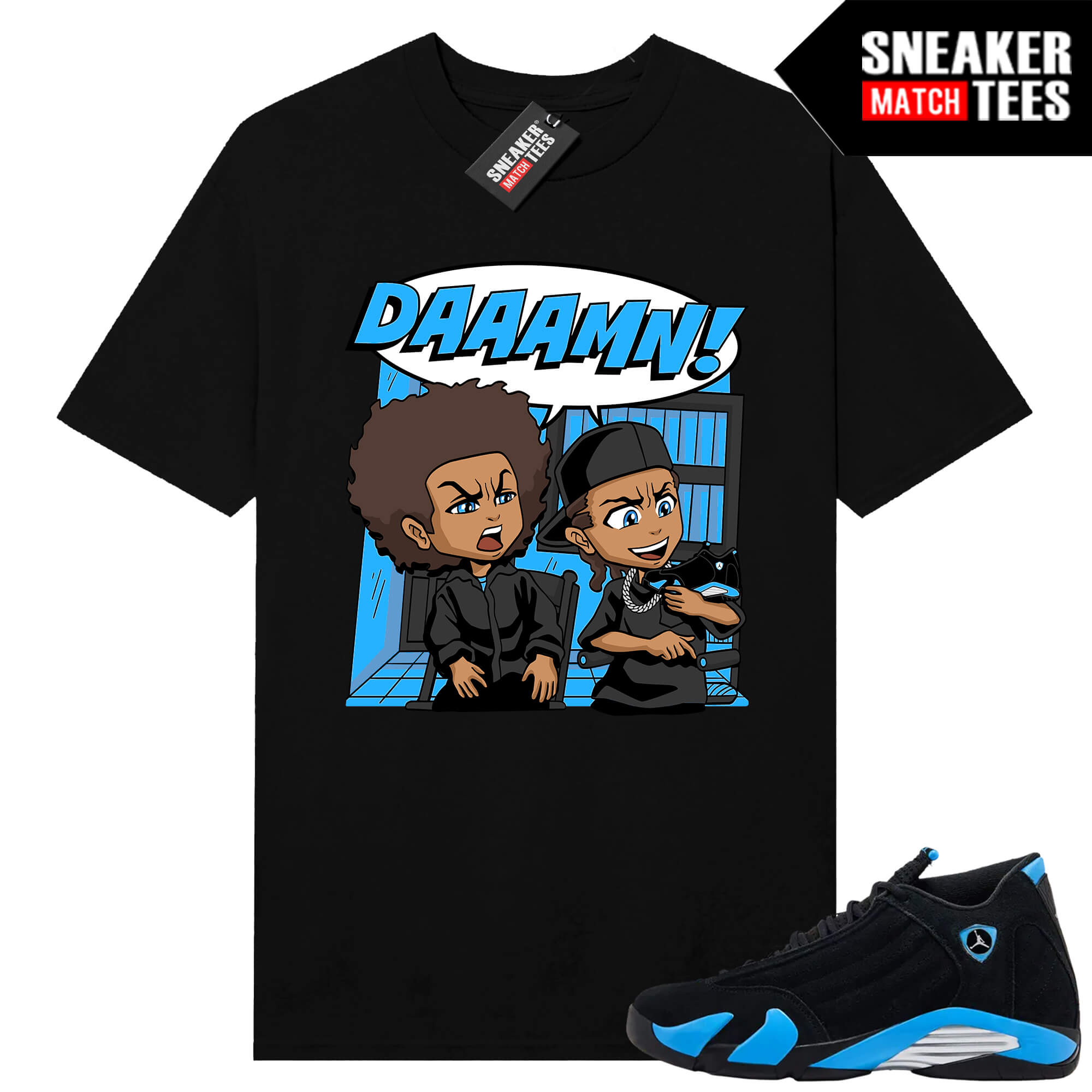 Black University Blue 14s x Sneaker Match ® Collection. Jordan 14 Black University Blue Sneaker Match Tees Black DAAAMN Boondocks Parody. Sneaker clothing and graphic sneaker tees to match the latest sneakers.