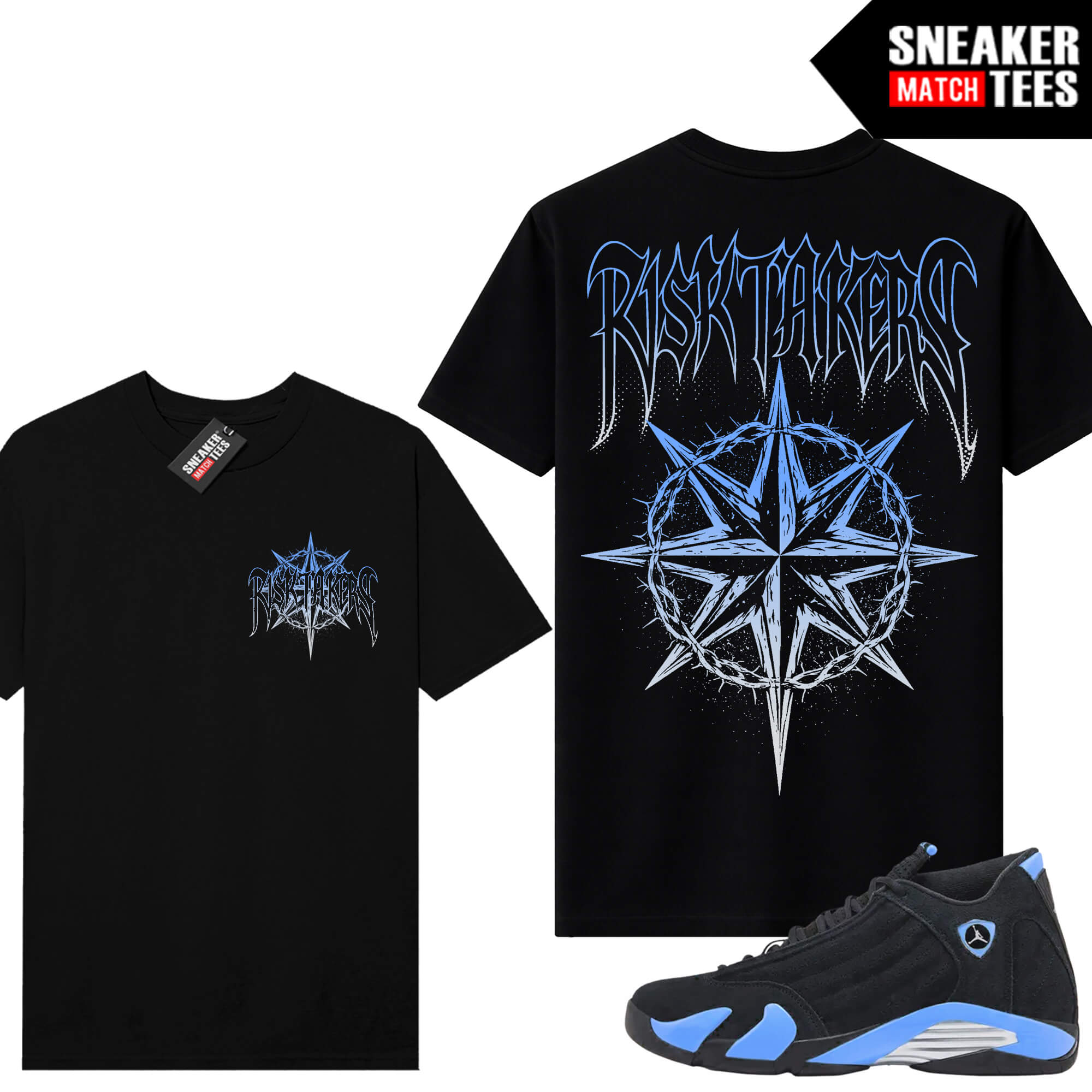 Black University Blue 14s x Sneaker Match ® Collection. Jordan 14 Black University Blue Sneaker Match Tees Black V2 Risktakers Thorn Star. Sneaker clothing and graphic sneaker tees to match the latest sneakers.