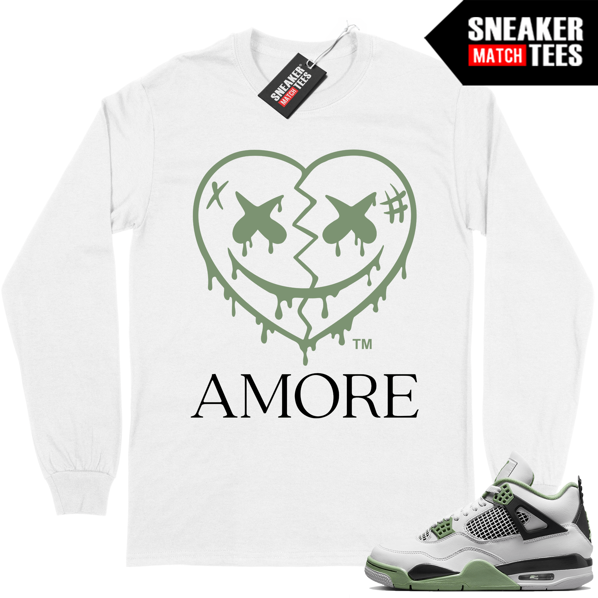 AMORE ™ x Sneaker Match ® Collection. Jordan 4 Seafoam Long Sleeve shirt Sneaker Match White AMORE Crazy Love Heart. Sneaker clothing and graphic sneaker tees to match the latest sneakers.