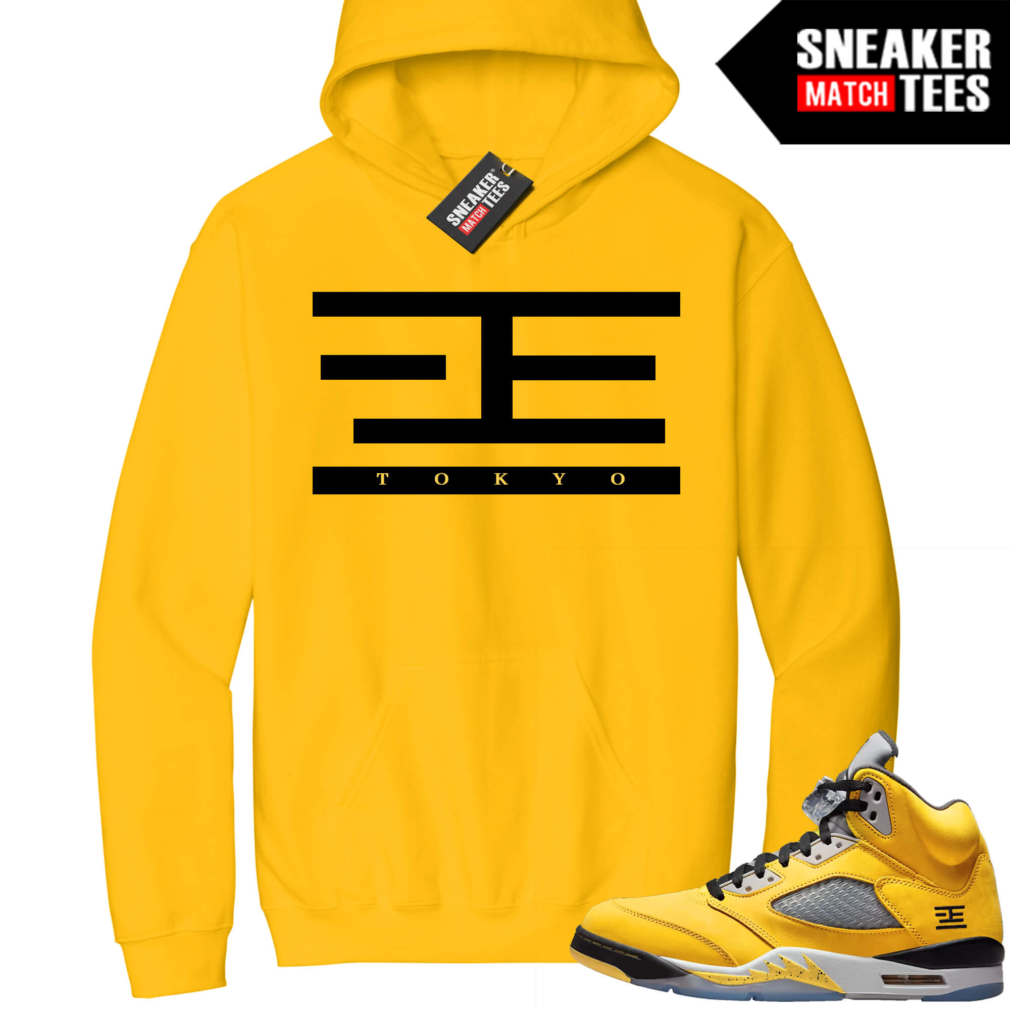 Jordan 5 Tokyo Sneaker Match Hoodie Yellow T23 Logo. Sneaker Match Hoodies designed to match Tokyo 5 colorway. Sneaker clothing and apparel to match Jordan 5 Tokyo retro sneakers.