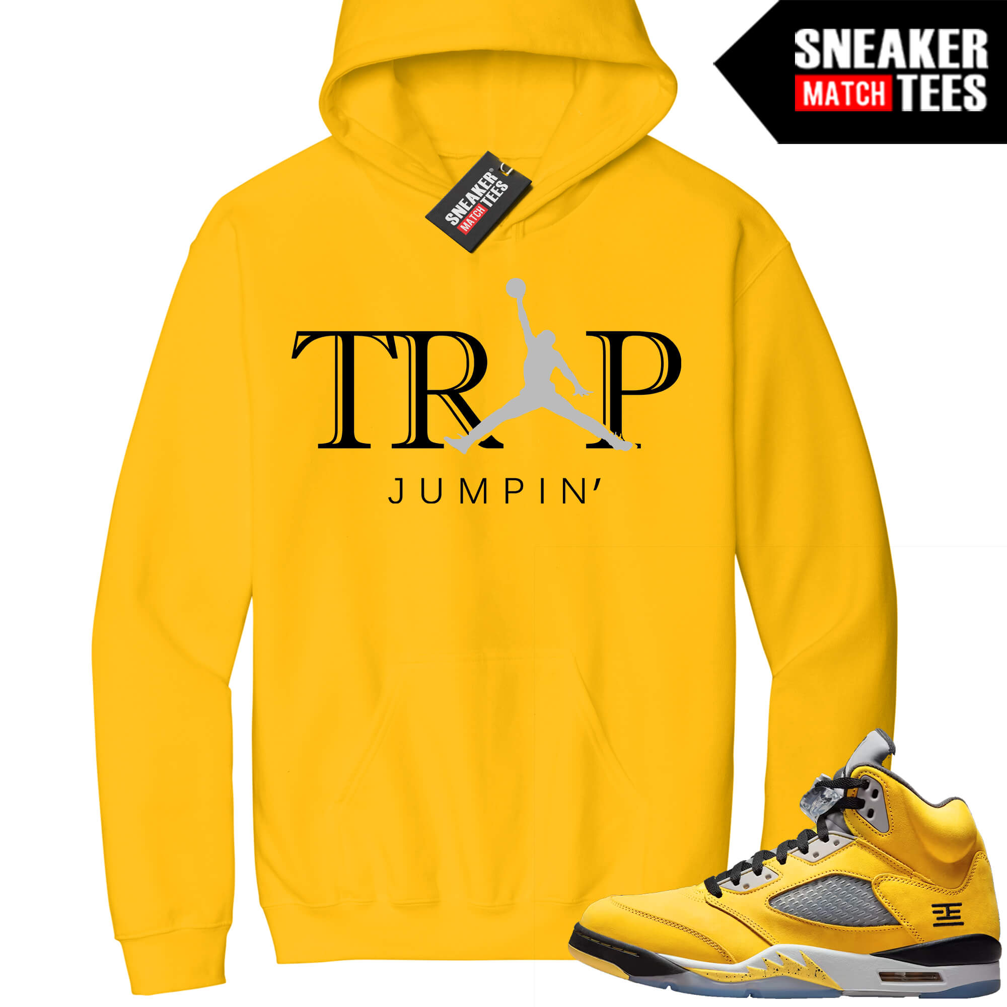 Jordan 5 Tokyo Sneaker Match Hoodie Yellow Trap Jumpin. Sneaker Match Hoodies designed to match Tokyo 5 colorway. Sneaker clothing and apparel to match Jordan 5 Tokyo retro sneakers.