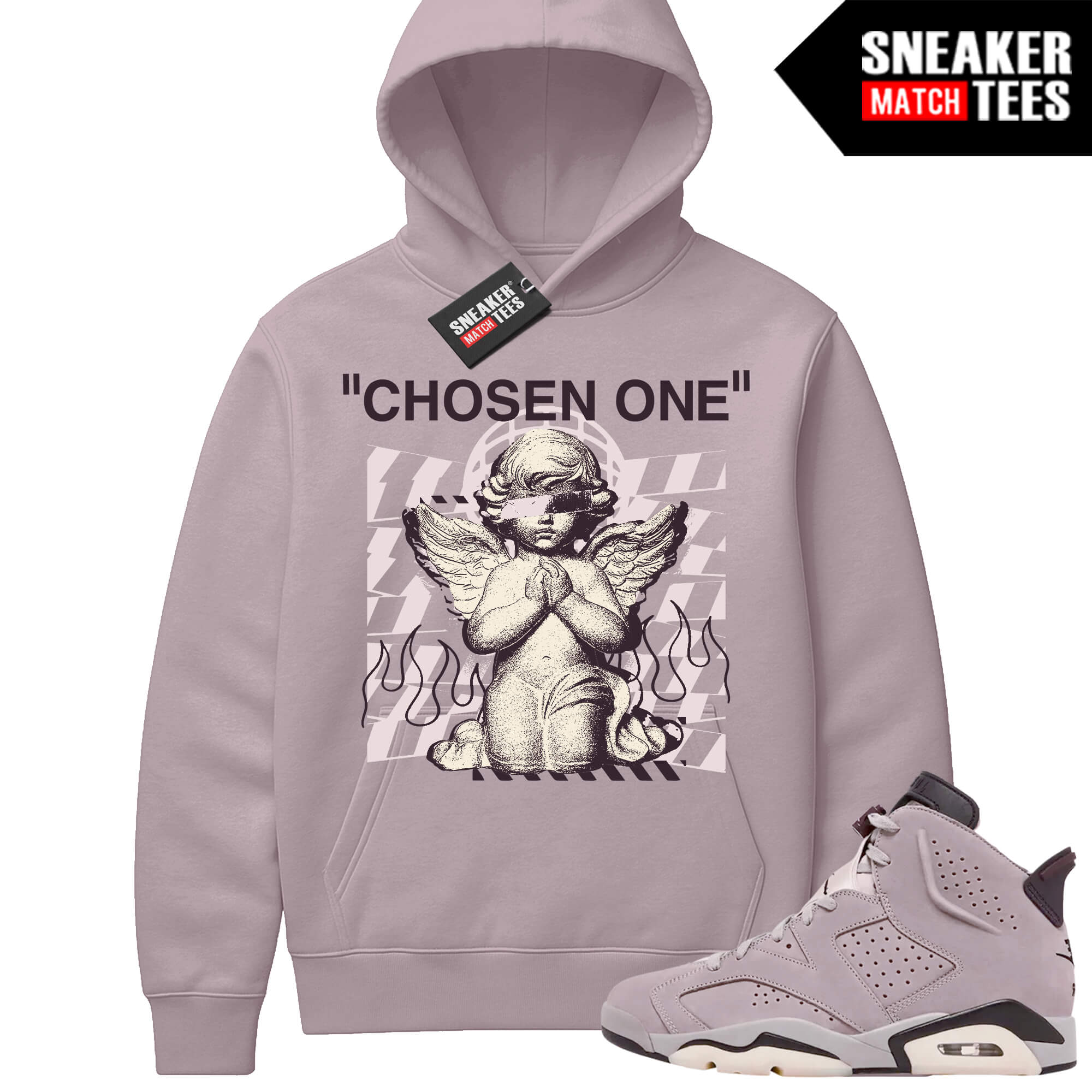 Jordan 6 AMM Smokey Mauve Sneaker Match Hoodie Mauve Chosen One. Sneaker Match Hoodies designed to match Mauve 6s colorway. Sneaker clothing and apparel to match Jordan 6 AMM Mauve retro sneakers.