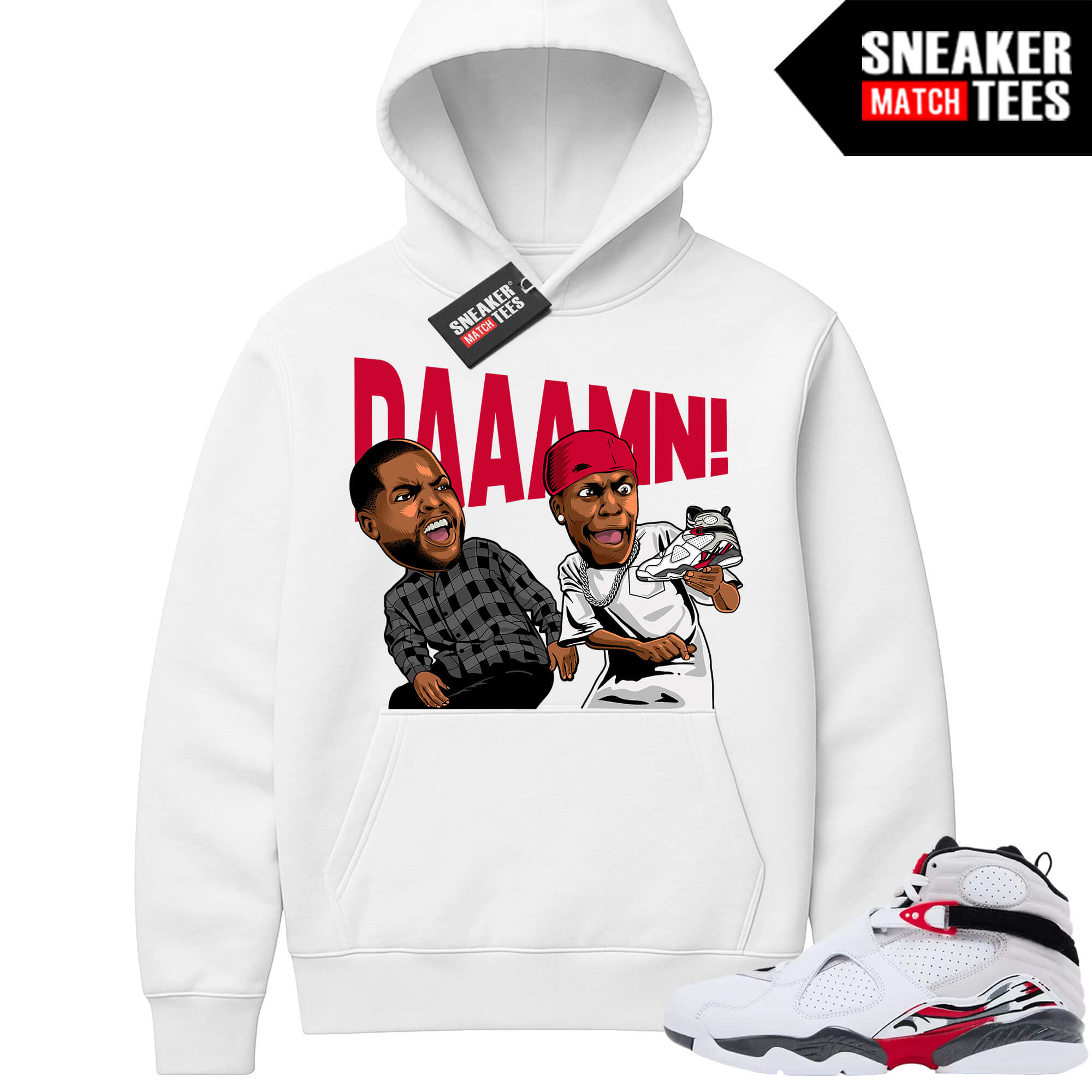 Jordan 8 Bugs Bunny Sneaker Match Hoodie White Daaamn. Sneaker Match Hoodies designed to match Bugs Bunny 8s colorway. Sneaker clothing and apparel to match Jordan 8 Bugs Bunny retro sneakers.