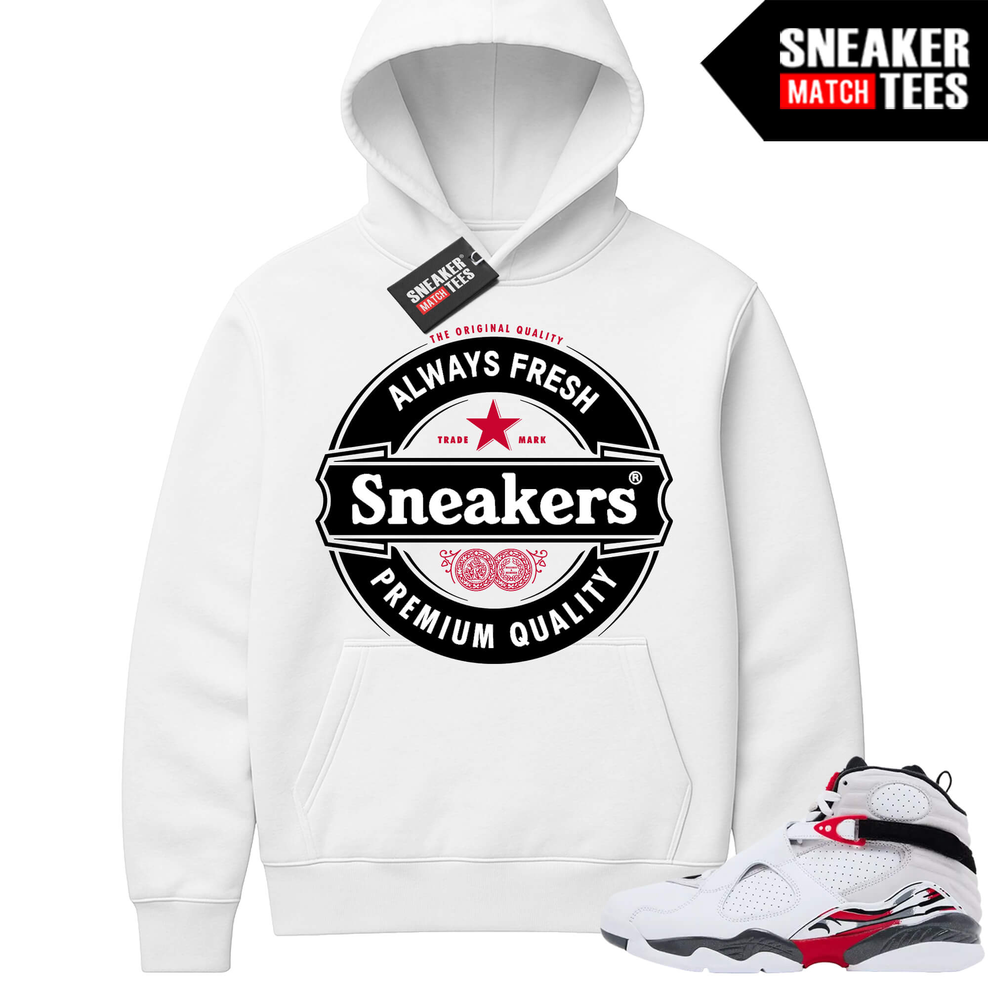 Jordan 8 Bugs Bunny Sneaker Match Hoodie White Sneakers. Sneaker Match Hoodies designed to match Bugs Bunny 8s colorway. Sneaker clothing and apparel to match Jordan 8 Bugs Bunny retro sneakers.