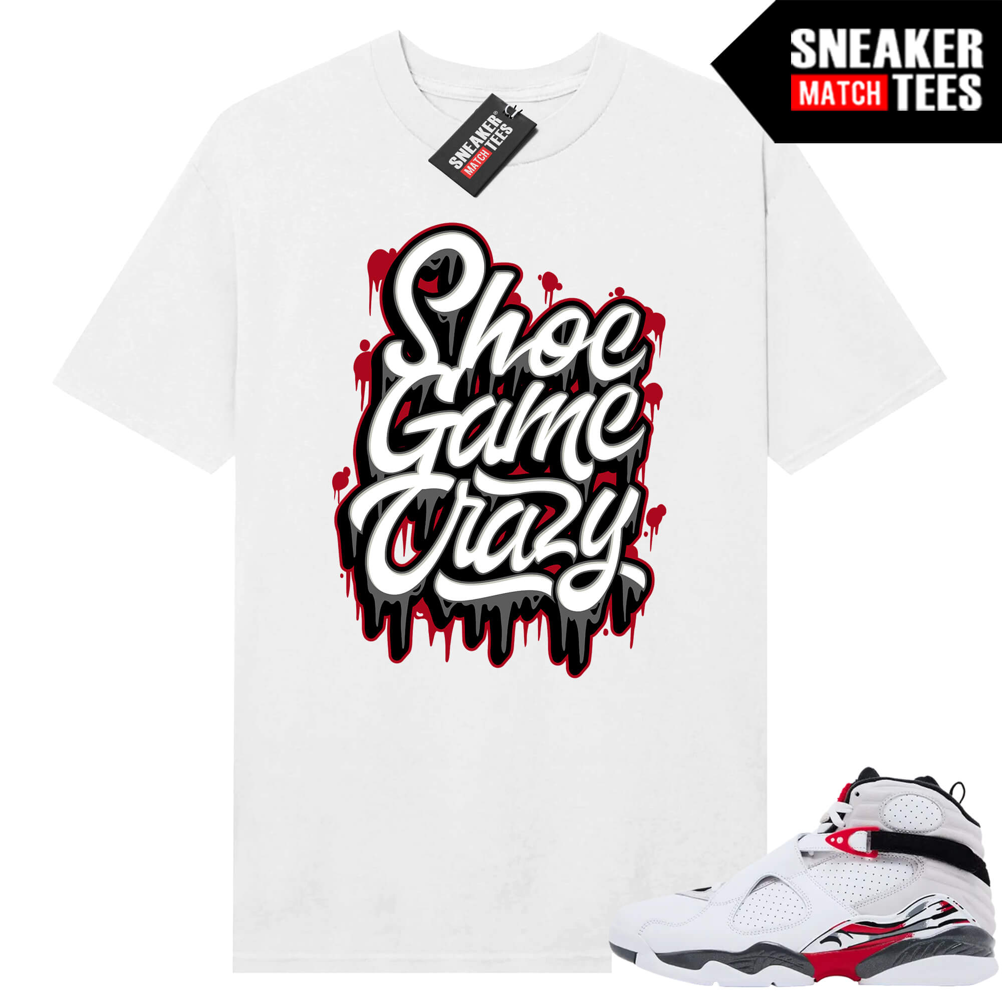 The “Shoe Game Crazy” Tee shirt was designed to match with your Jordan 8 sneakers. This design is exclusive to Sneaker Match Tees Online shop. Complete your Sneaker outfit with this exclusive design.