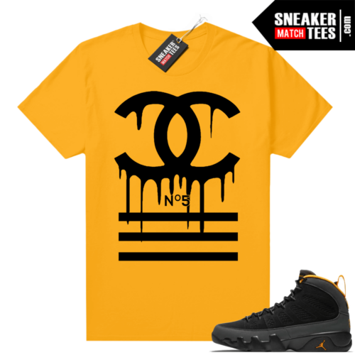 Jordan 9 University Gold Shirt Designer Drip. Sneaker Match shirts designed to match University Gold 9s colorway. Sneaker clothing and apparel to match Jordan 9 retro sneakers.