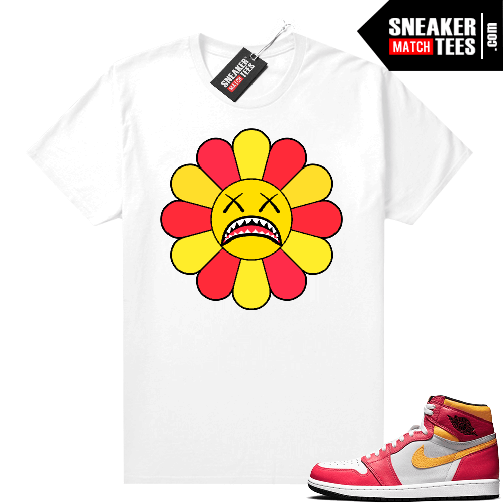 Light Fusion Red 1s Jordan Sneaker Tees Shirts Match White SunFlower Smiley. Sneaker Match shirts designed to match Fusion Red 1s colorway. Sneaker clothing and apparel to match Jordan 1 retro sneakers.