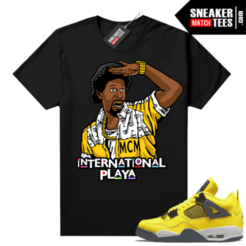 Lightning 4s Jordan Sneaker Tees Black Jerome International Playa. Sneaker Match shirts designed to match Yellow Jordan 4s “Lightning” colorway. Sneaker clothing and apparel to match Jordan 4 retro sneakers.