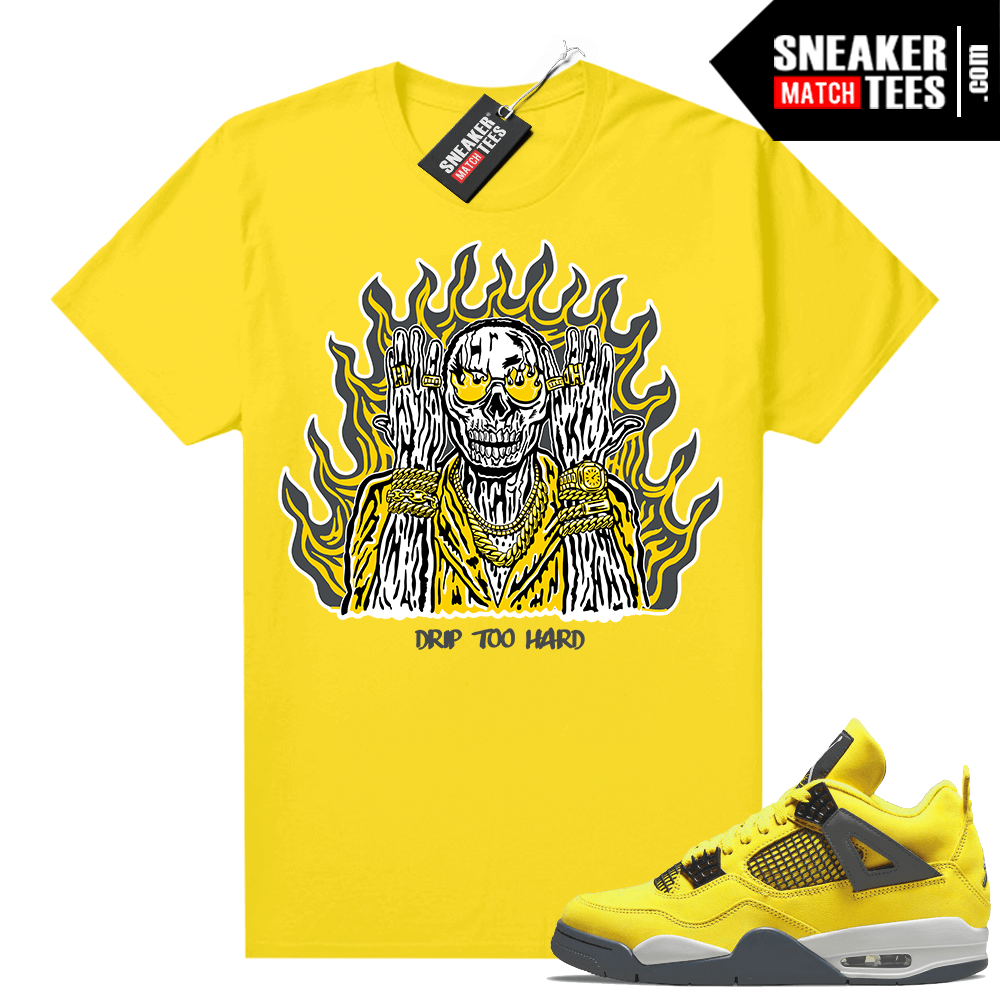 Lightning 4s Jordan Sneaker Tees Yellow Drip Too Hard. Sneaker Match shirts designed to match Yellow Jordan 4s “Lightning” colorway. Sneaker clothing and apparel to match Jordan 4 retro sneakers.