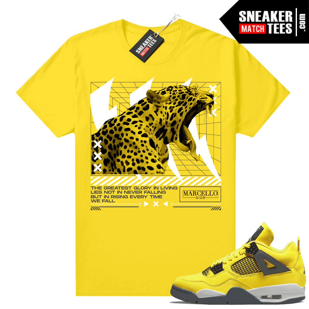 Lightning 4s Jordan Sneaker Tees Yellow Marcello Gior Rising. Sneaker Match shirts designed to match Yellow Jordan 4s “Lightning” colorway. Sneaker clothing and apparel to match Jordan 4 retro sneakers.