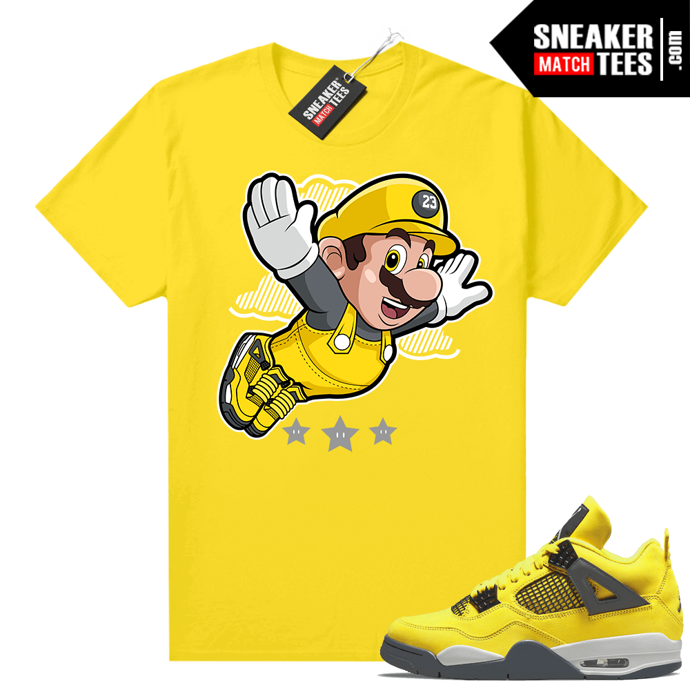 Lightning 4s Jordan Sneaker Tees Yellow Mario Fly. Sneaker Match shirts designed to match Yellow Jordan 4s “Lightning” colorway. Sneaker clothing and apparel to match Jordan 4 retro sneakers.