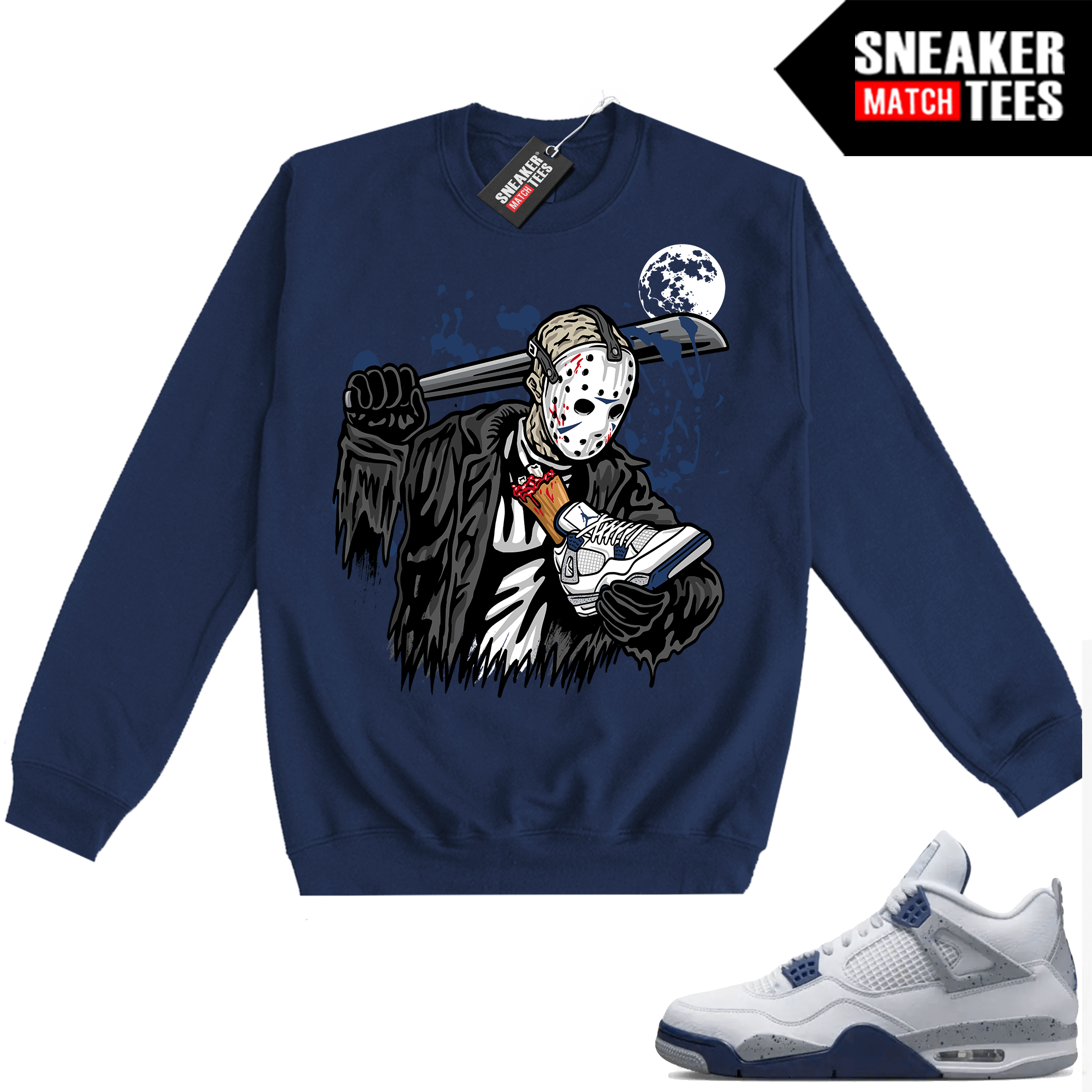 The Jordan 4 Midnight Navy “Jason x AJ4” Sweatshirt was designed to match with your Air Jordan sneakers. This design is exclusive to Sneaker Match Tees Online shop. Complete your Sneaker outfit with this exclusive design.