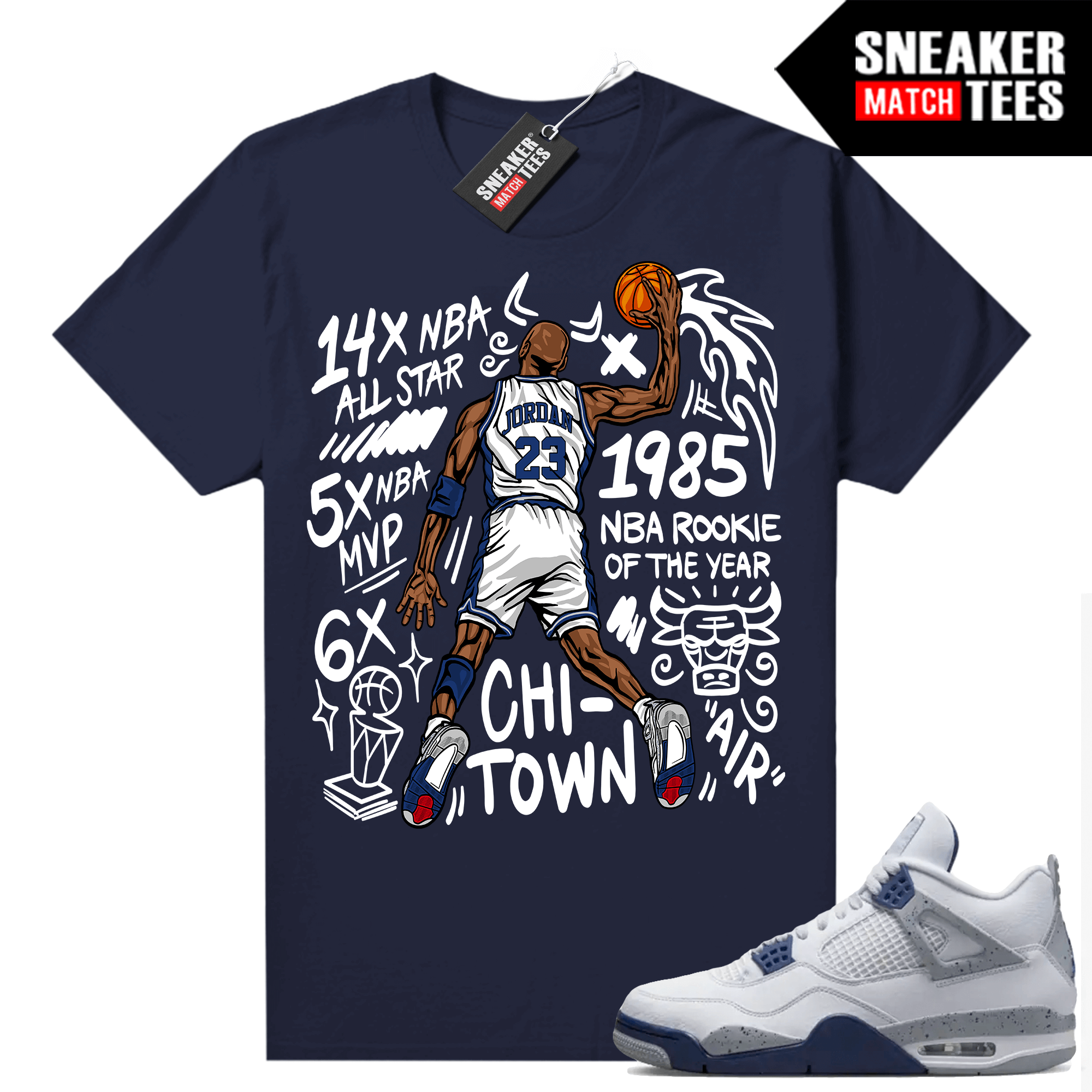 The Midnight Navy 4s “MJ Slam Dunk” shirt was designed to match with your Air Jordan sneakers. This design is exclusive to Sneaker Match Tees Online shop. Complete your Sneaker outfit with this exclusive design.
