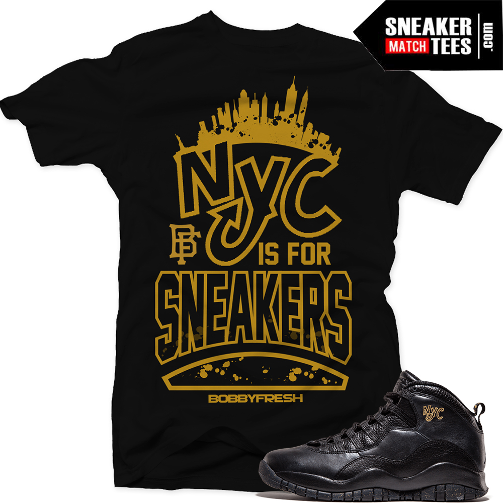 NYC 10s match sneaker tee shirts. Air Jordan 10 NYC. T shirt designed to match NYC 10s Jordan sneaker colorway. View the entire matching collection of Jordan 10 NYC Apparel.