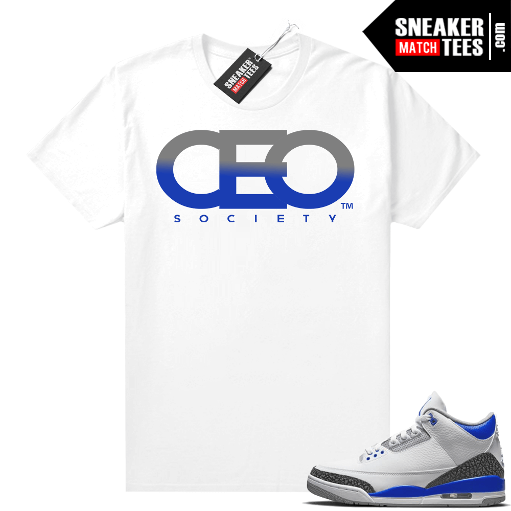 Racer Blue 3s Jordan Sneaker Tees CEO Society. Sneaker Match shirts designed to match Racer Blue 3 colorway. Sneaker clothing and apparel to match Jordan 3 retro sneakers.