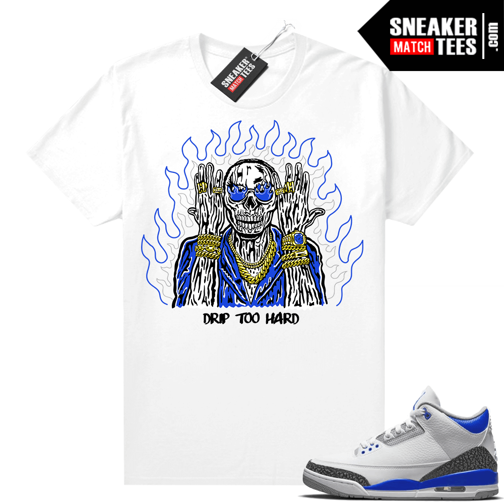 Racer Blue 3s Jordan Sneaker Tees Drip Too Hard. Sneaker Match shirts designed to match Racer Blue 3 colorway. Sneaker clothing and apparel to match Jordan 3 retro sneakers.