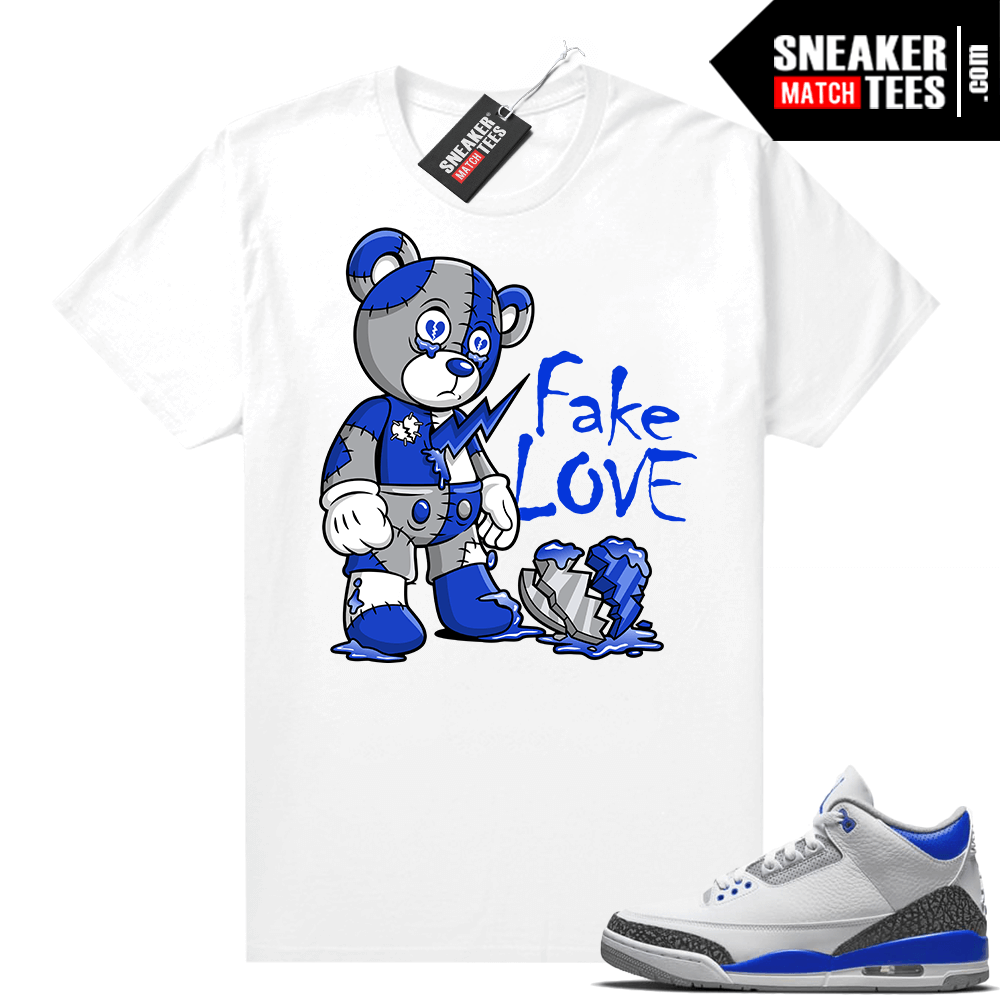 Racer Blue 3s Jordan Sneaker Tees Fake Love Bear V2. Sneaker Match shirts designed to match Racer Blue 3 colorway. Sneaker clothing and apparel to match Jordan 3 retro sneakers.