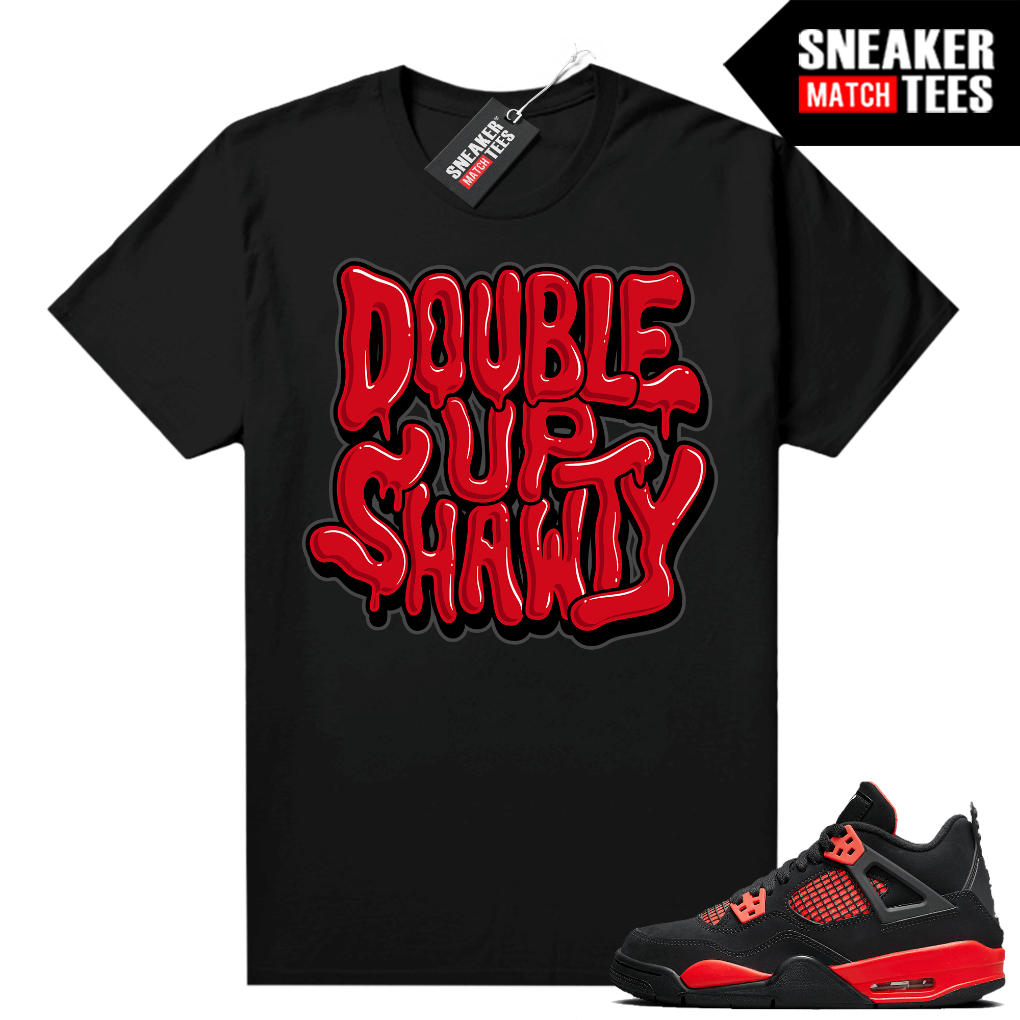 Red Thunder 4s Sneaker Match Tees Black Double Up Shawty. Sneaker Match shirts designed to match Jordan 4 “Red Thunder” colorway. Sneaker clothing and apparel to match Jordan 4 retro sneakers.