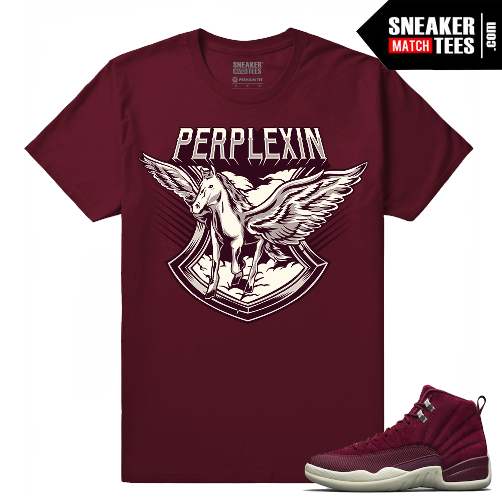 Shirts Match Jordan 12 Bordeaux. Sneaker Match Tees ® “Pegasus” Bordeaux Streetwear T-shirt. Jordan 12 sneaker tee matching streetwear clothing collection. Air Jordan 12 Bordeaux colorway. View the entire Sneaker Match Tees ® matching collection of Jordan 12 Bordeaux Shirts, hoodies, and crewneck sweaters.
