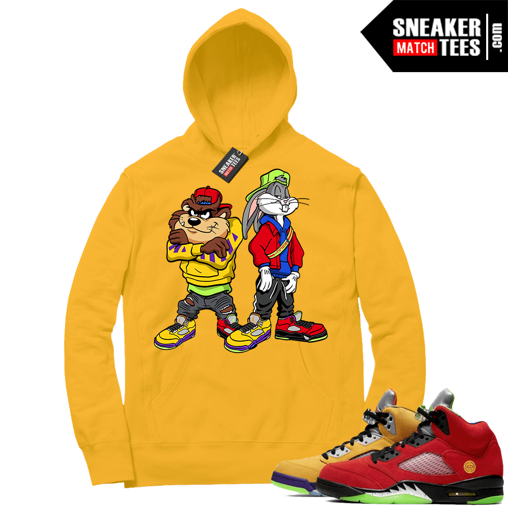 What the 5s Sneaker Hoodie Yellow Gold Bugz and Taz. Sneaker Match Hoodies designed to match What the 5s colorway. Sneaker clothing and apparel to match Jordan 5 retro shoes.