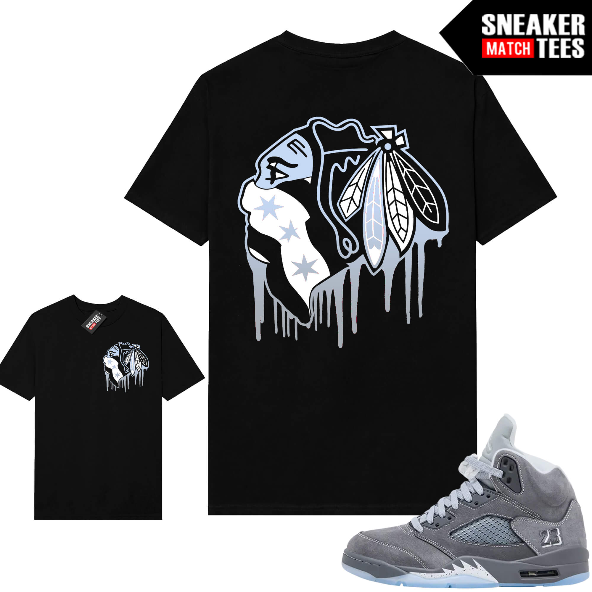 The “Black Hawks Drip V2” Tee shirt was designed to match with your Jordan 5 sneakers. This design is exclusive to Sneaker Match Tees Online shop. Complete your Sneaker outfit with this exclusive design.