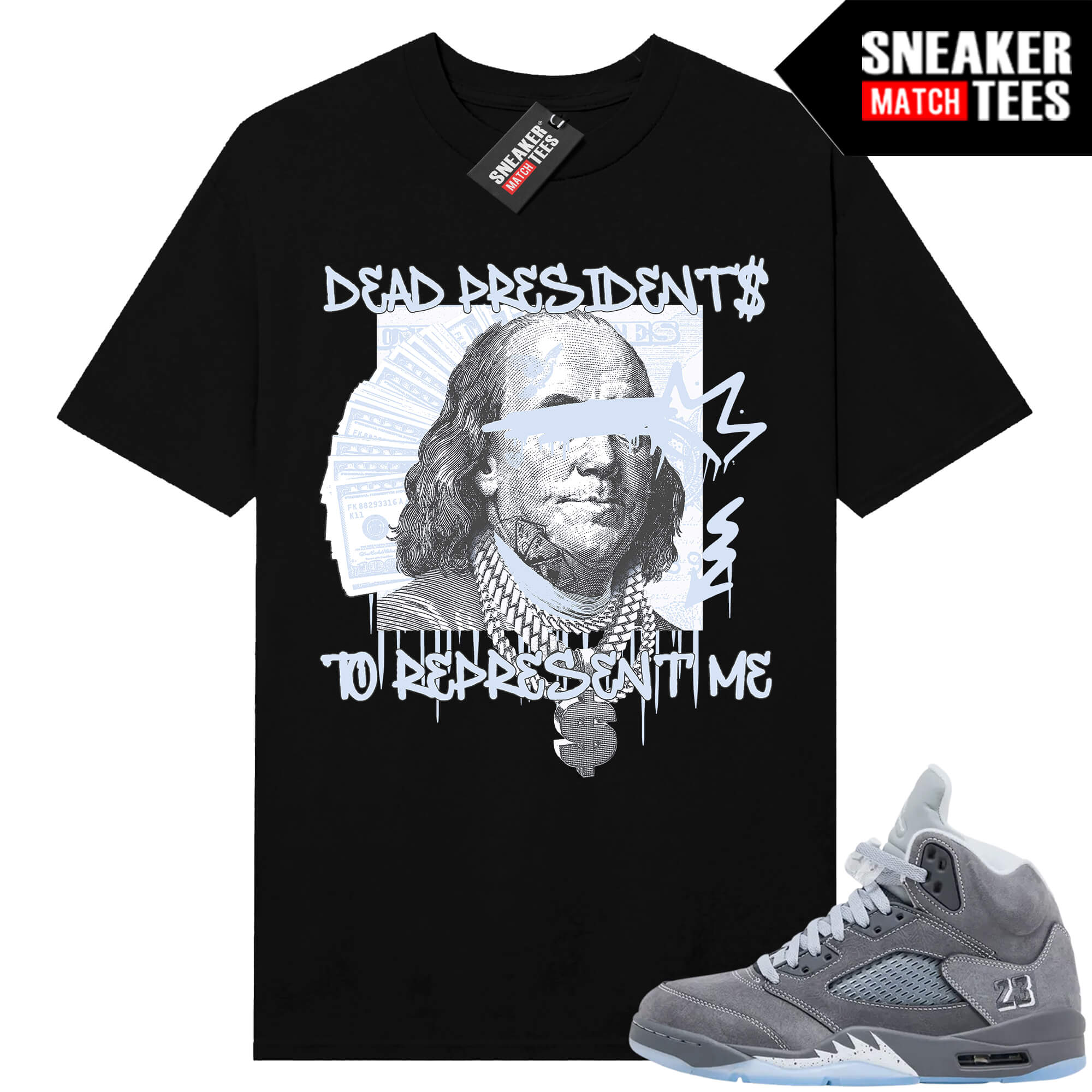 Jordan 5 Wolf Grey x Sneaker Match ® Collection. Wolf Grey 5s Sneaker Match Tees Black Dead Presidents Represnt me. Sneaker clothing and graphic sneaker tees to match the latest sneakers.