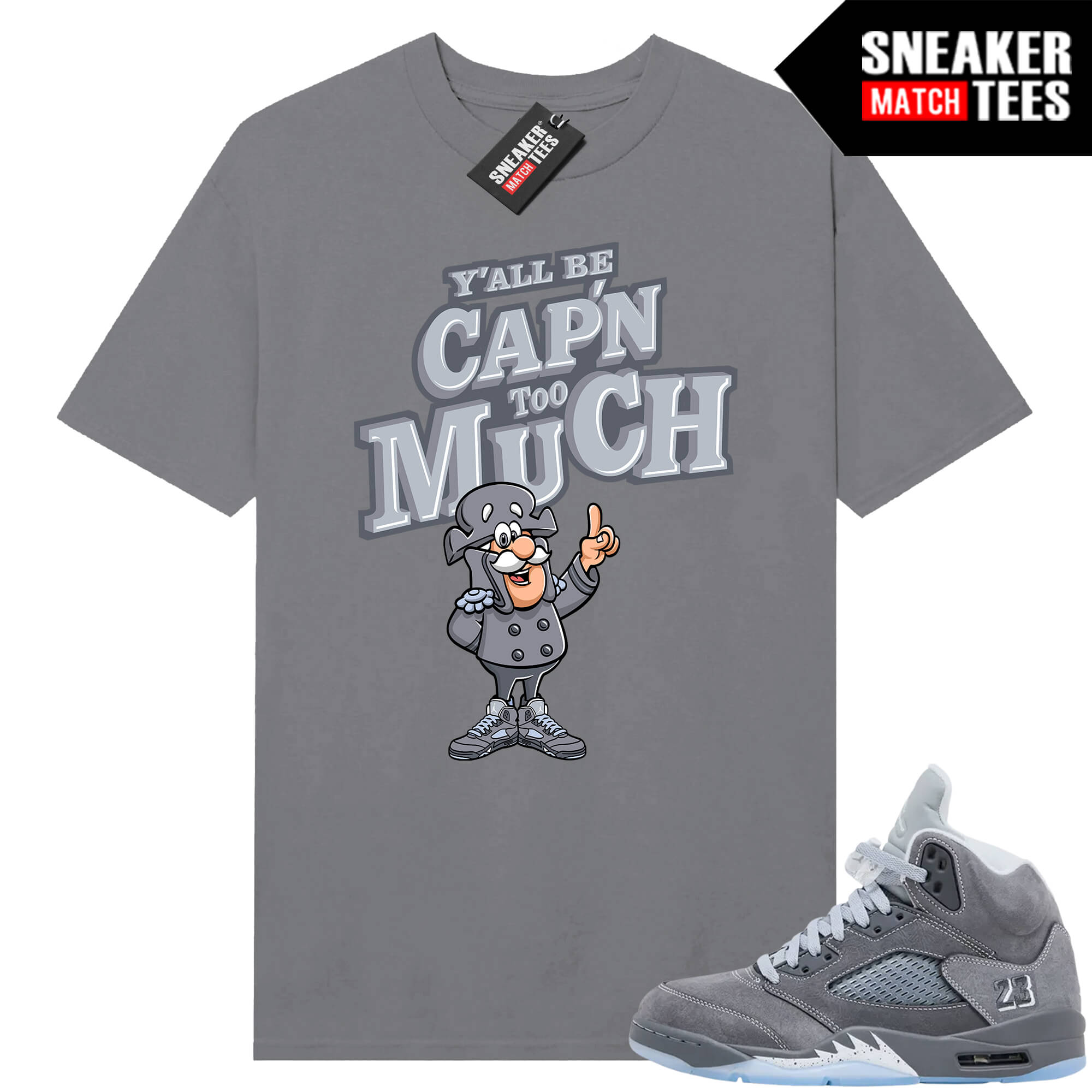 The “CAPN too Much” Tee shirt was designed to match with your Jordan 5 sneakers. This design is exclusive to Sneaker Match Tees Online shop. Complete your Sneaker outfit with this exclusive design.