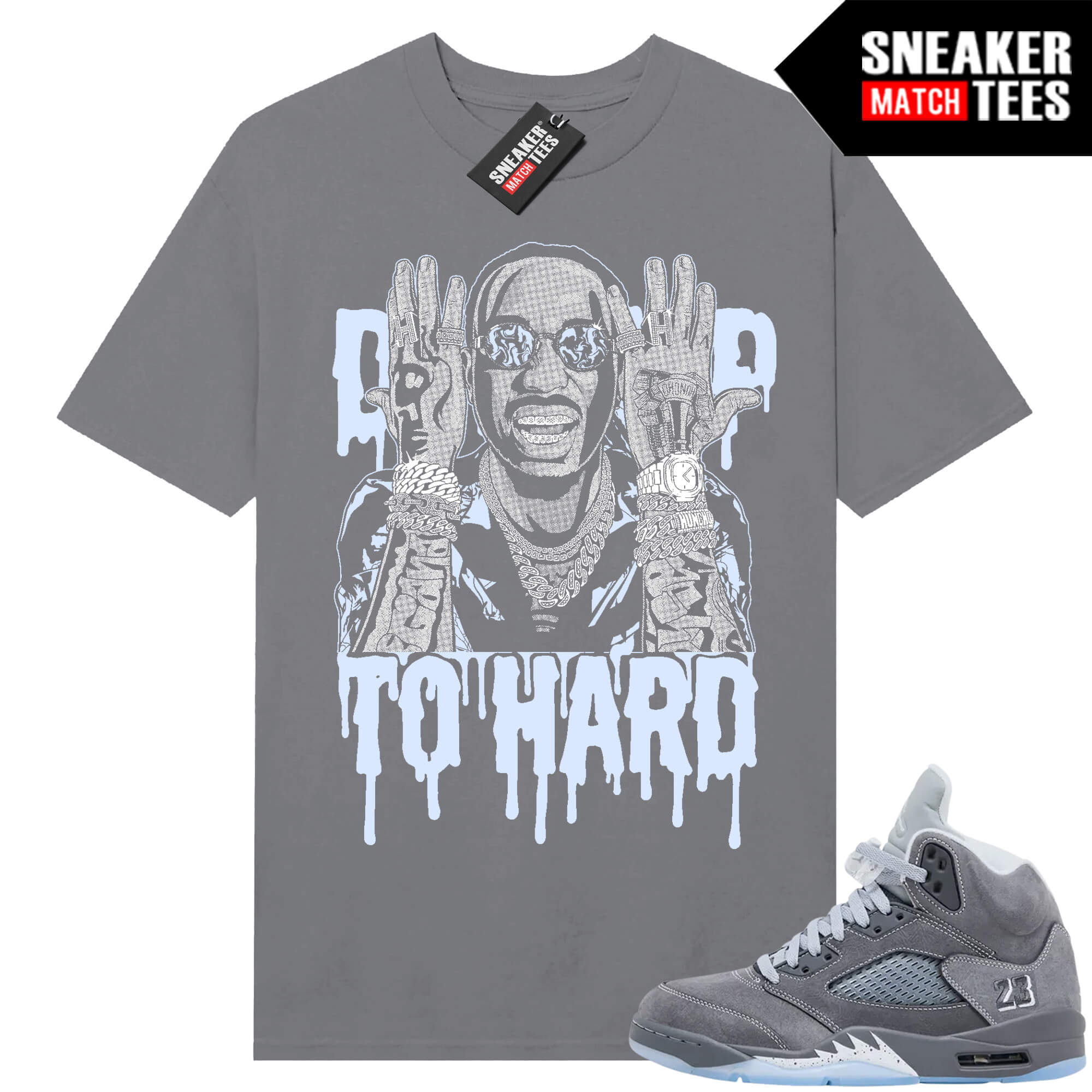 The “Drip Too Hard” Tee shirt was designed to match with your Jordan 5 sneakers. This design is exclusive to Sneaker Match Tees Online shop. Complete your Sneaker outfit with this exclusive design.