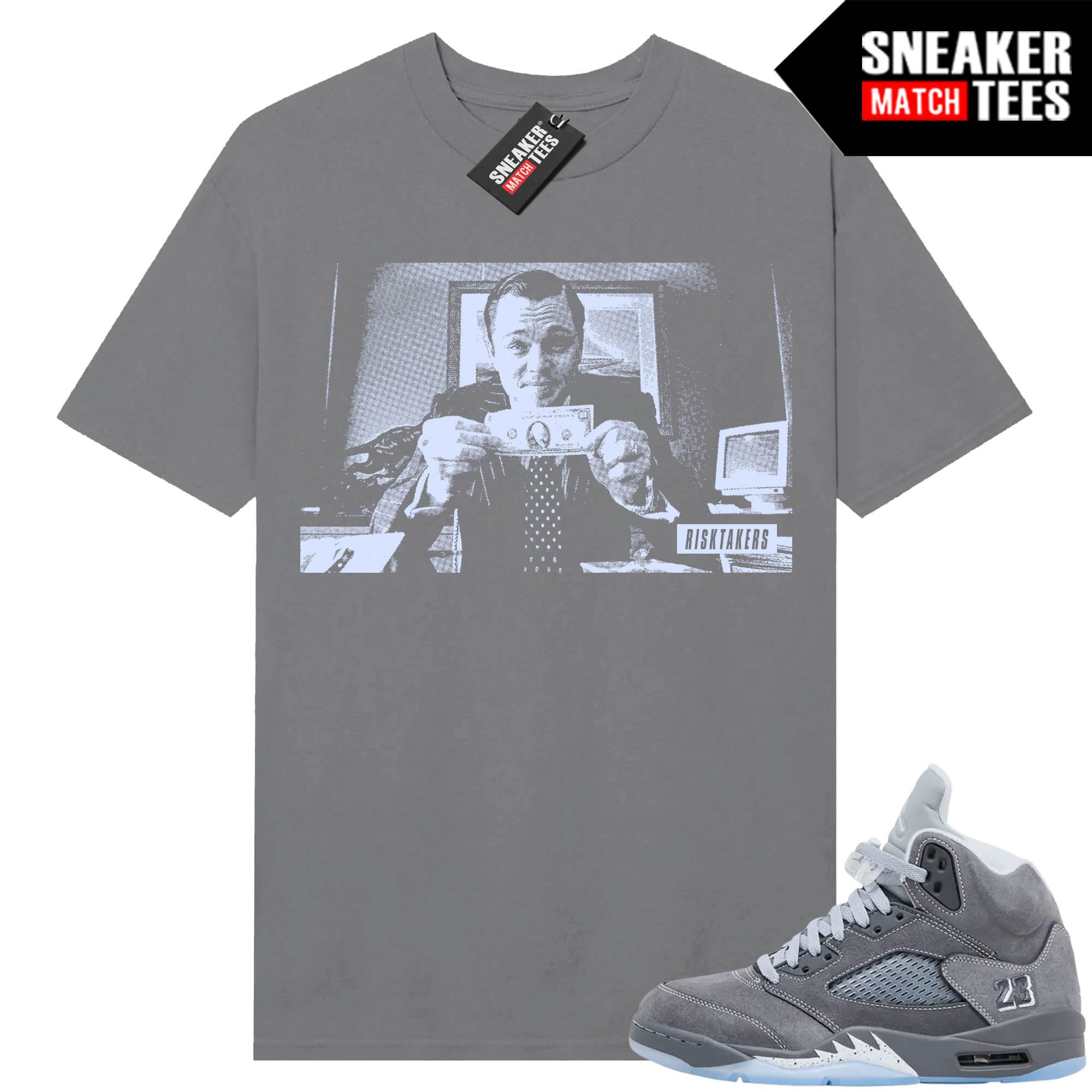 The “Risktakers Wolf OF Wallstreet” Tee shirt was designed to match with your Jordan 5 sneakers. This design is exclusive to Sneaker Match Tees Online shop. Complete your Sneaker outfit with this exclusive design.