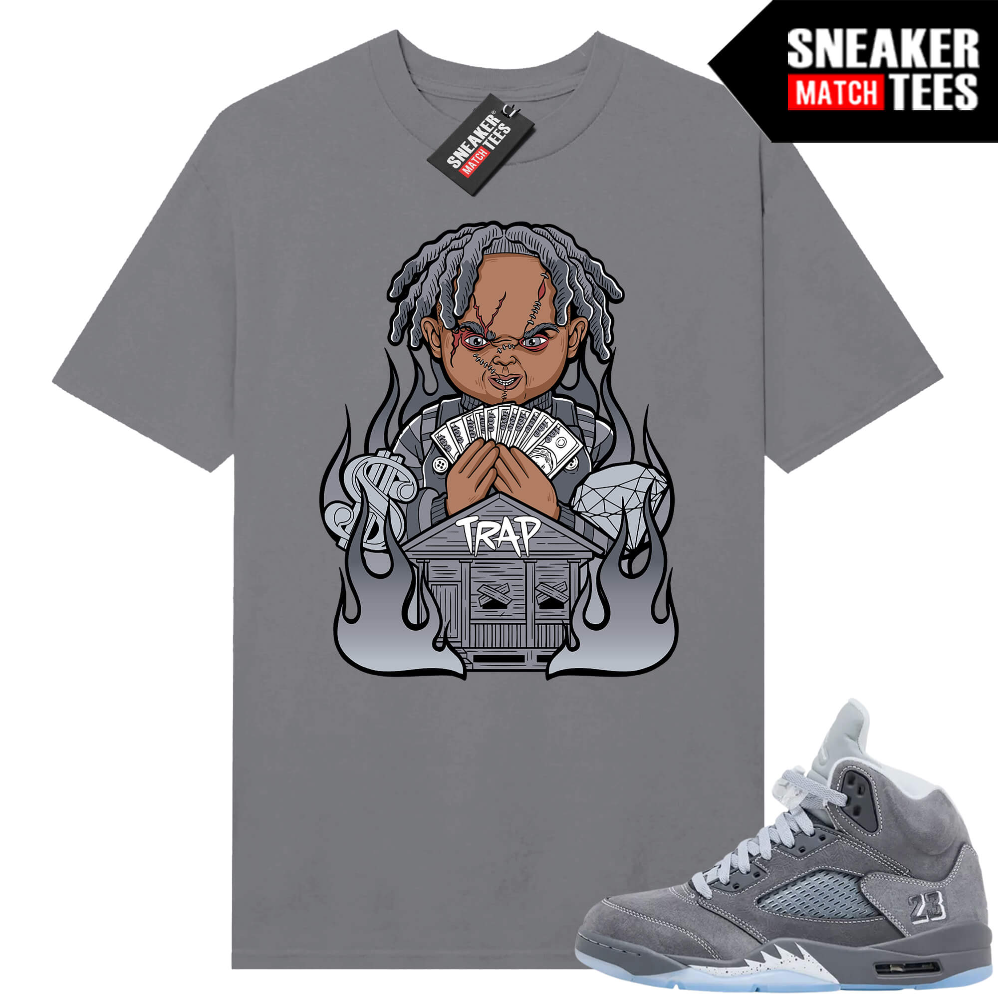 Jordan 5 Wolf Grey x Sneaker Match ® Collection. Wolf Grey 5s Sneaker Match Tees Wolf Grey T-shirt Trap Chucky. Sneaker clothing and graphic sneaker tees to match the latest sneakers.